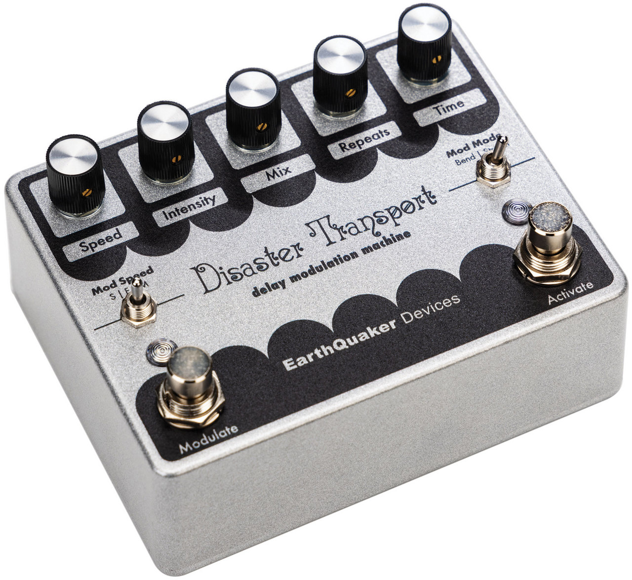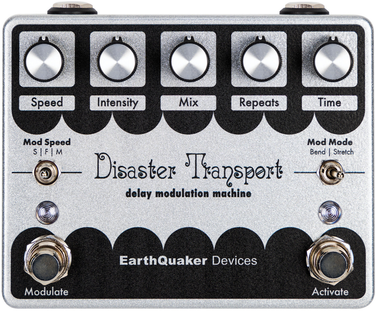 1. Speed: モジュレーションの速度の調整。Speedは(Slow/Fast/Medium)の3種のレンジをMod Speedトグルスイッチで設定できます。このDisaster Transportは“のこぎり波”(Ramp Wave)をモジュレーションに採用しているので、他のモジュレーションディレイの揺れより強く感じるとかも知れません。昔からの馴染みの有る定番の“三角波”(Triangle Wave)のモジュレーションがサイクルの途中で崖から落ち、再度迫り上がる様な、過激なピッチベンドを想像してみてください。これを頭に入れておいてピッチの動きを設定しても良いですし、もちろん直感的に耳を頼りに使うのもアリです。