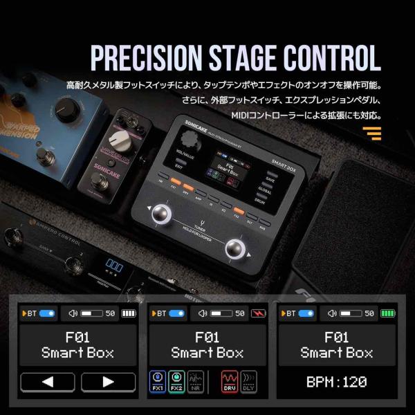 ステージでの使用も考慮されており、20秒ルーパー、正確なチューナー、メトロノーム、100種類のドラムリズムを搭載。耐久性のある金属製フットスイッチはマルチカラーLEDリング付きで、エフェクト切替やタップテンポ操作を確実かつ直感的に行えます。