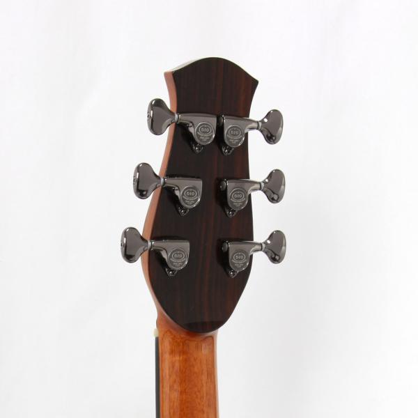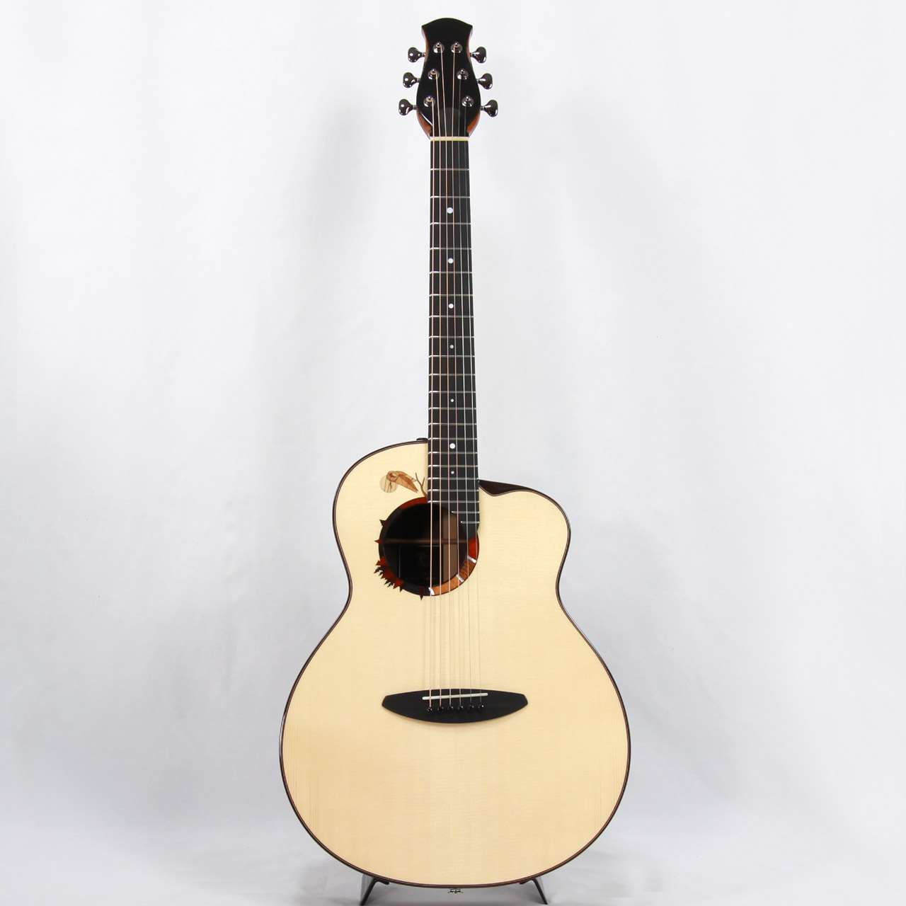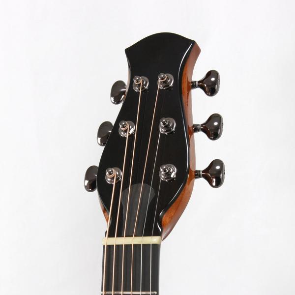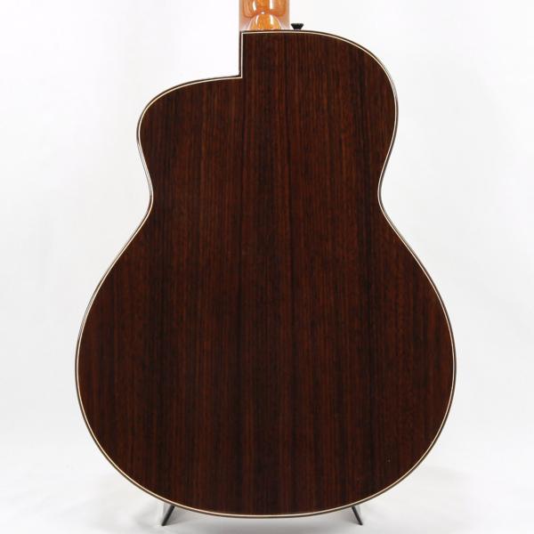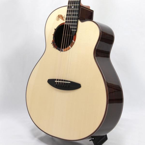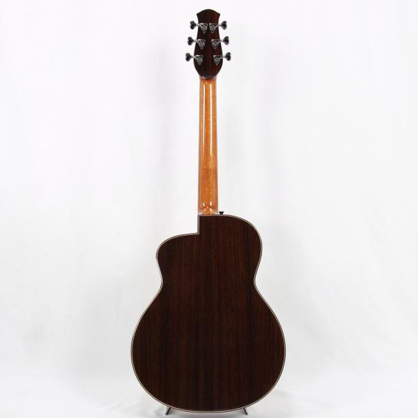 MartinのOMサイズに近しいサイズ感で、やや胴厚を深めにすることで内容量を確保しており、オフセットサウンドホールながらも豊かな生鳴りを実現。非常に洗礼された濁りのないきめ細やかな音色は杉田氏のギターに通じるフィーリングを感じることができます。暴れずに引き締まった低域とクッキリと芯の残るプレーン弦の響きはとても美しいバランス感で、ハイエンドギターに匹敵する仕上がりとなっております。