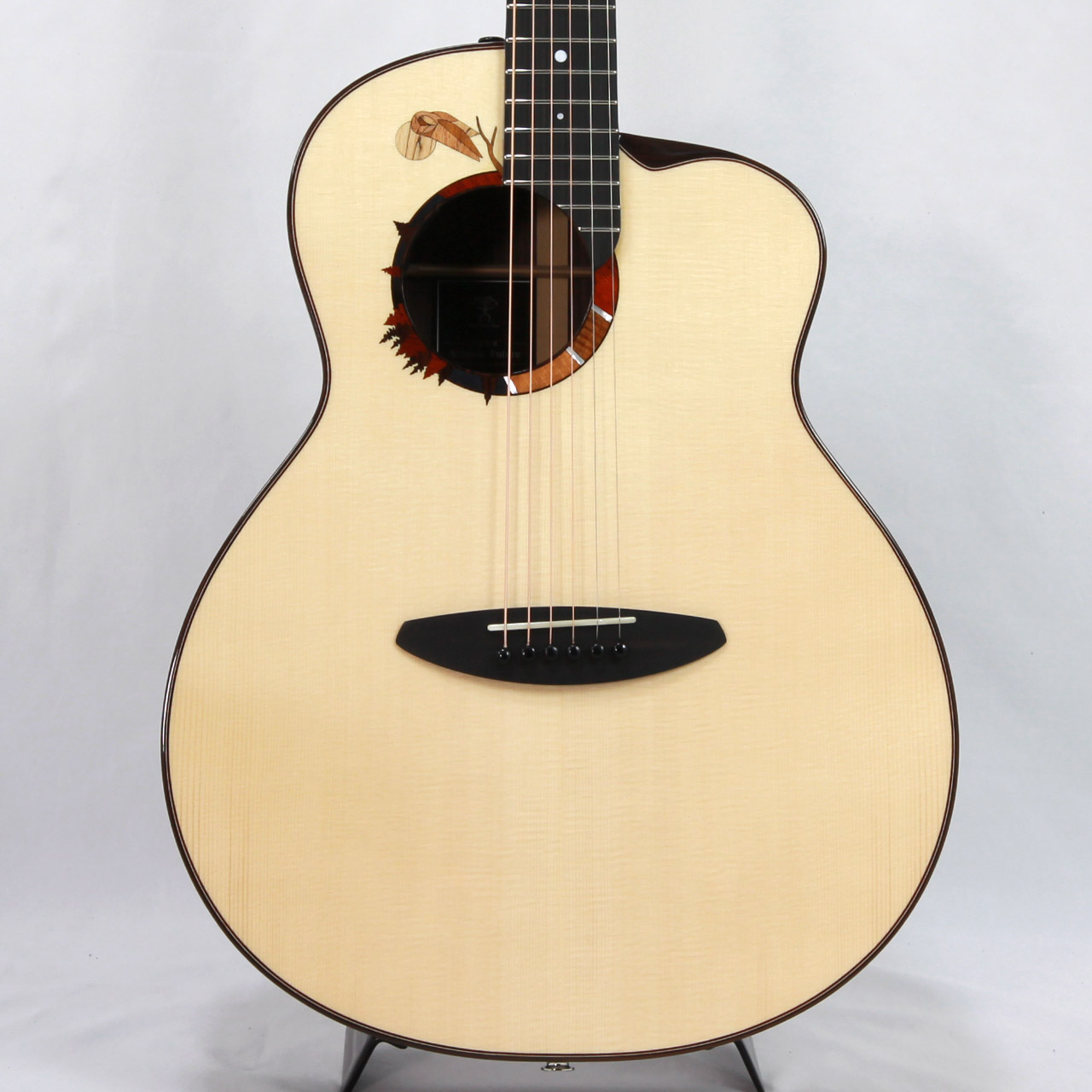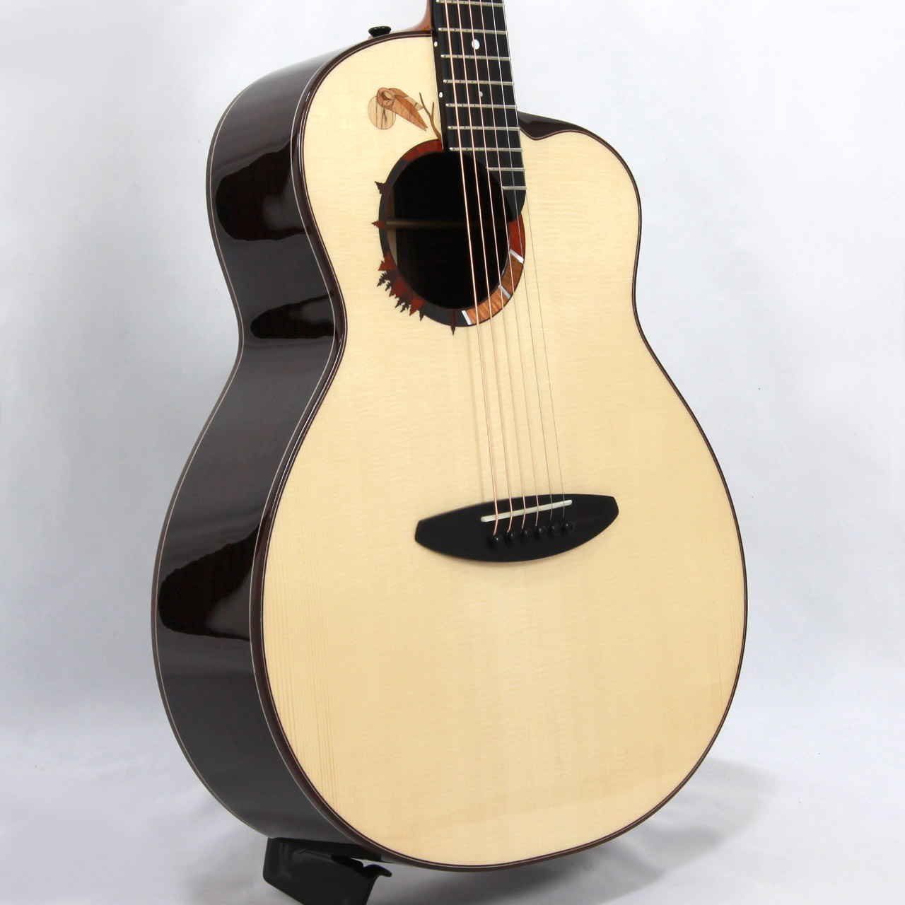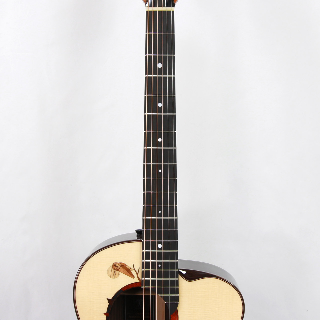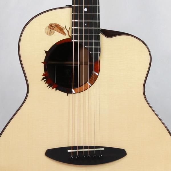 サウンドホール周辺の幾何学的なデザインには、アランが好んだフクロウのモチーフを採用。厳選された8種類の木材を複雑にはめ込み、月明かりに照らされたフクロウのいる森の情景を表現しています。ホワイト・マザー・オブ・パールの装飾は、森の中を優しく流れ落ちる月明かりをイメージしており、フィンガースタイル演奏時に魅力的な魅力を放ちます。