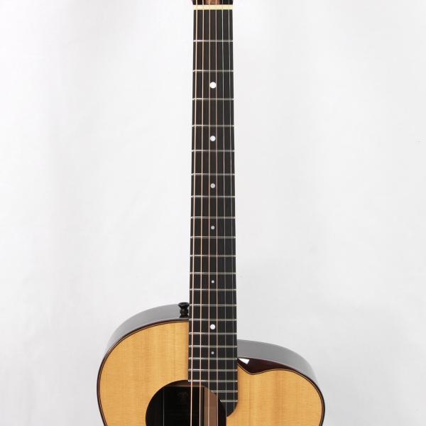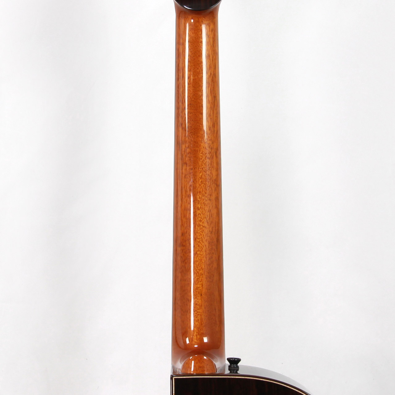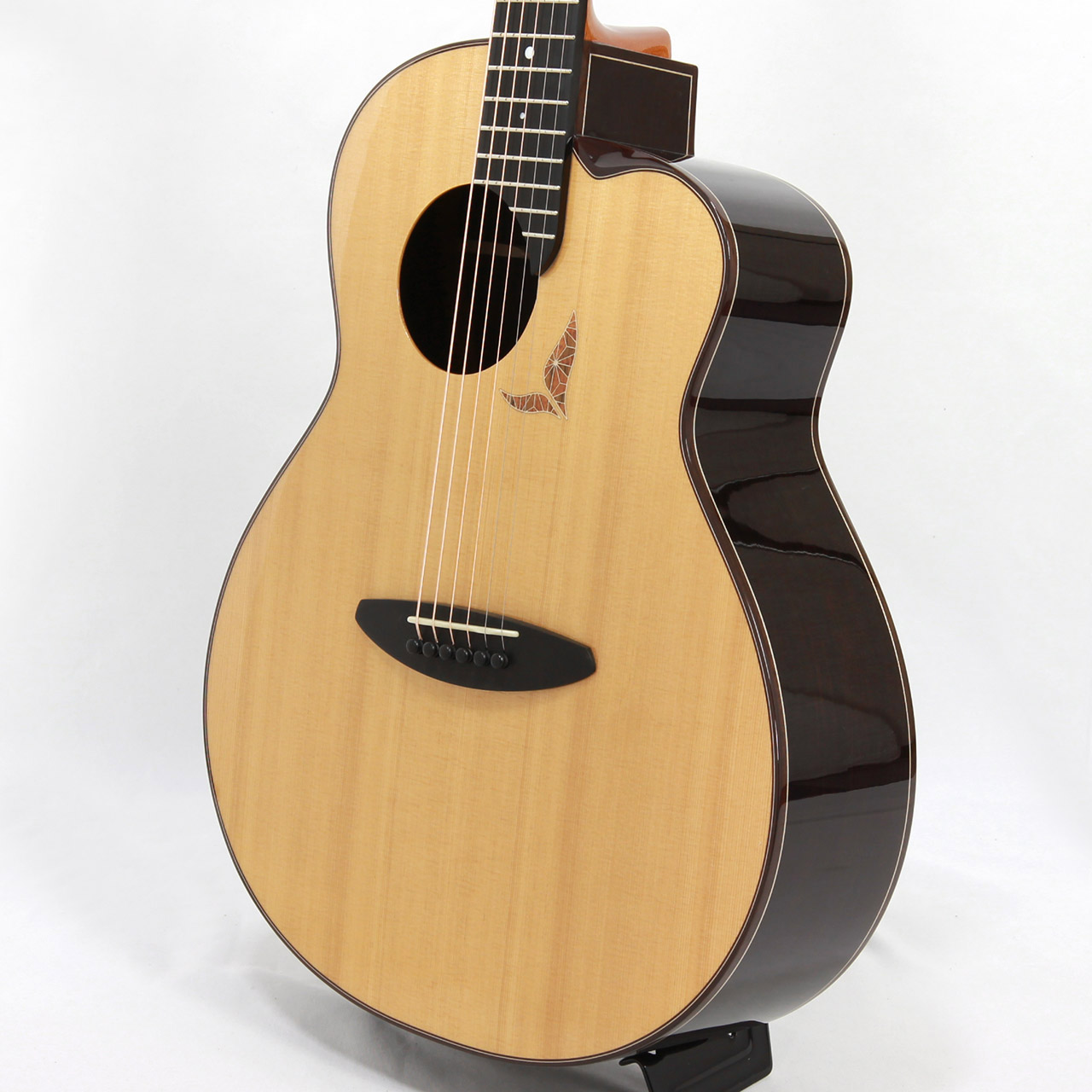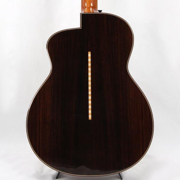 MartinのOMサイズに近しいサイズ感で、やや胴厚を深めにすることで内容量を確保しており、オフセットサウンドホールながらも豊かな生鳴りを実現。非常に洗礼された濁りのないきめ細やかな音色は杉田氏のギターに通じるフィーリングを感じることができます。暴れずに引き締まった低域とクッキリと芯の残るプレーン弦の響きはとても美しいバランス感で、ハイエンドギターに匹敵する仕上がりとなっております。
