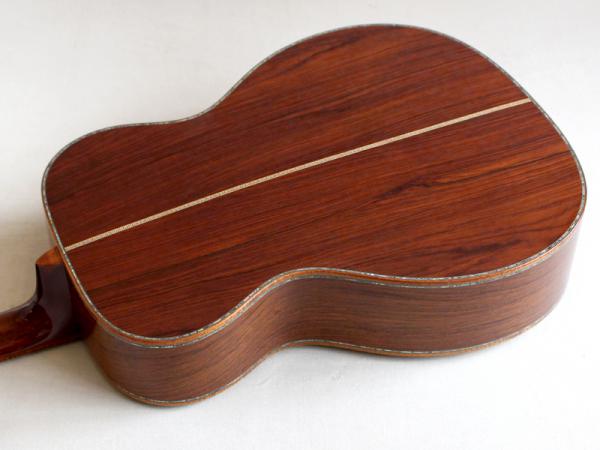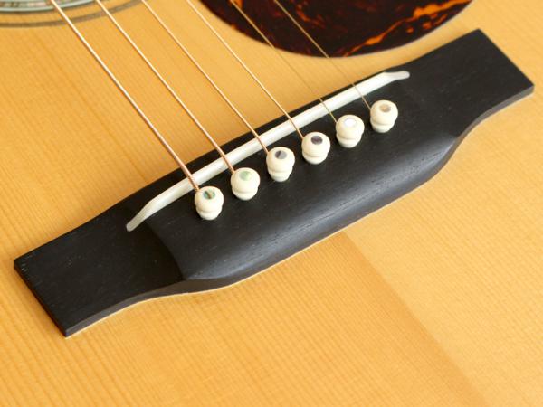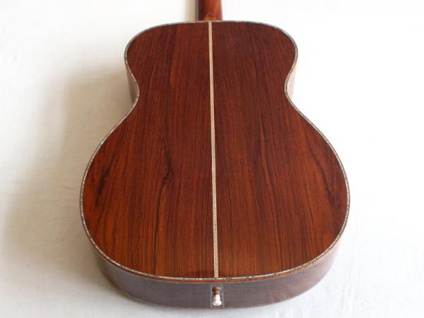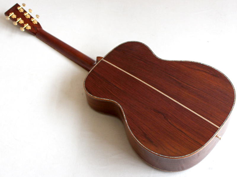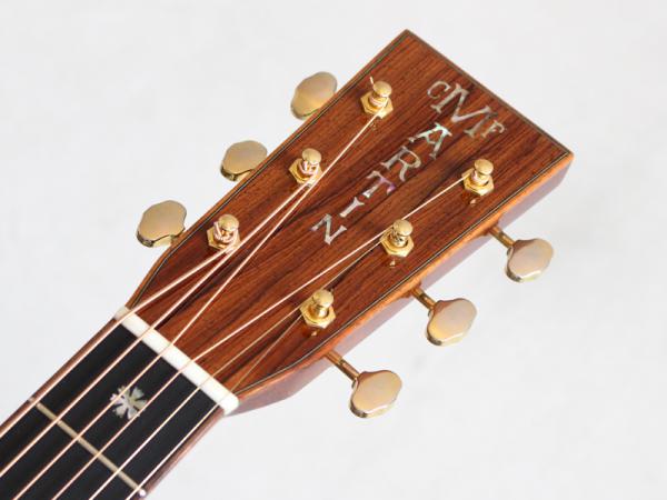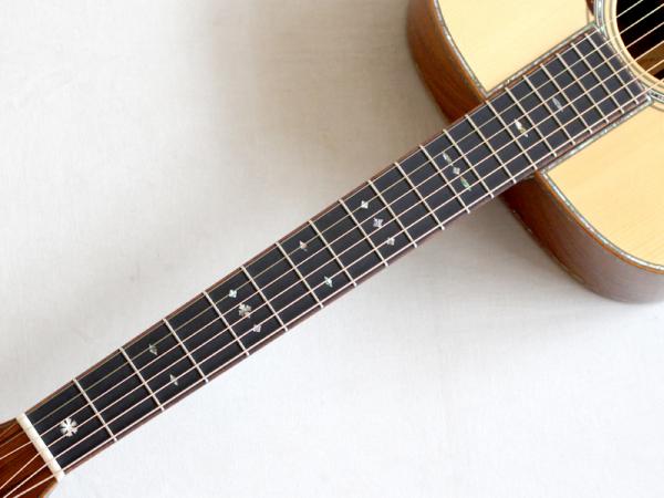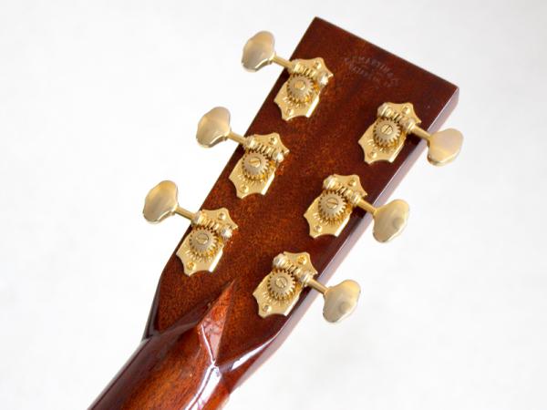 マホガニー材ネック(ナット幅44.5mmのMod Low Oval シェイプ)、エボニー材指板&ブリッジ、632.5mmスケール、Marquis スタイルのMARTINバーチカルロゴ&45 ロゼッタ、45スタイルのスノーフレイクインレイ、エイジングトナー・フィニッシュ、通常はアイボロイドのバインディングがハワイアンコア材のウッドバインディングに、そしてロングサドル仕様にカスタムされております。