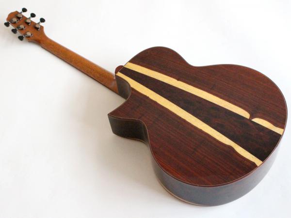本器はスモールジャンボ/Fカッタウェイで、ホワイトスプルース材トップ、ヨコヤマギターズで最もストック数があり良材が多かった2012年製のカマティロ材サイド&バック、当時秘蔵していた20年物のマホガニー材を使用した2Pネック、エボニー材指板&駒、22F仕様、パドゥーク材バインディング、44.5mmネックとまさにヨコヤマギターの歴史の中でも特に人気のある仕様の1本。