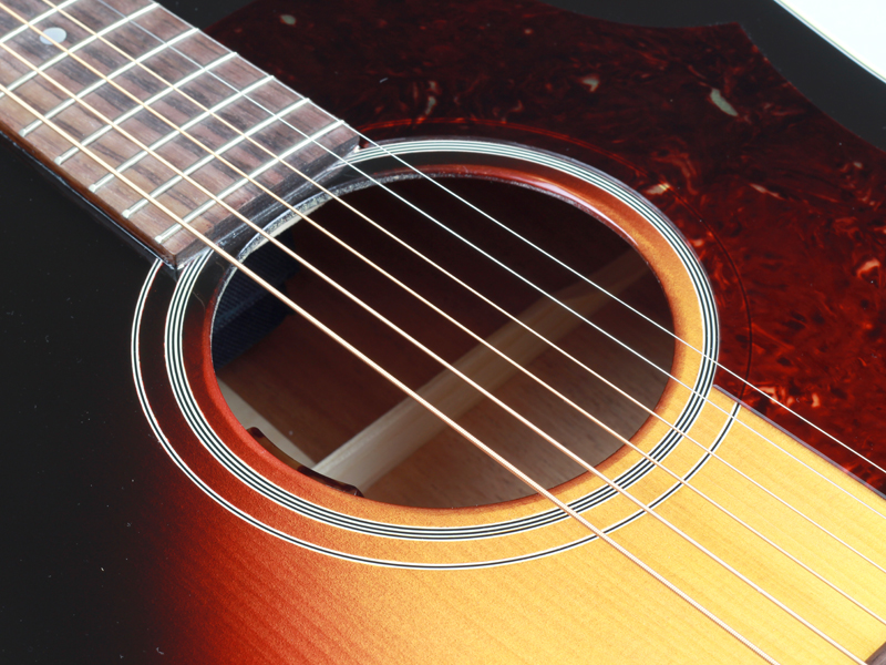 トップ材がアディロンダック・レッドスプルース、サイド&バック材はマホガニー、ローズウッド指板&駒、628mmスケール、2リング・パーフリング、ラージピックガード、アジャスタブルサドル、トライバーストカラー、L.R.Baggs社Lyricピッカップ搭載となっております。