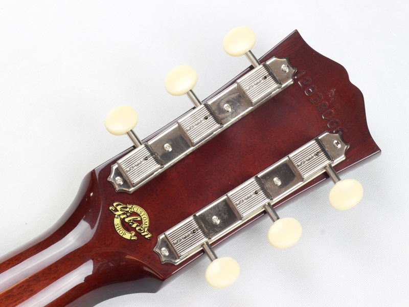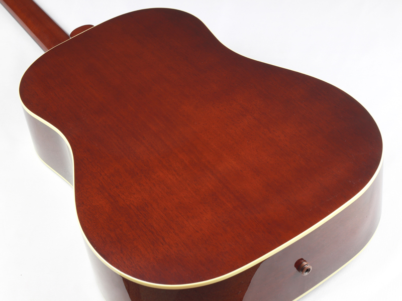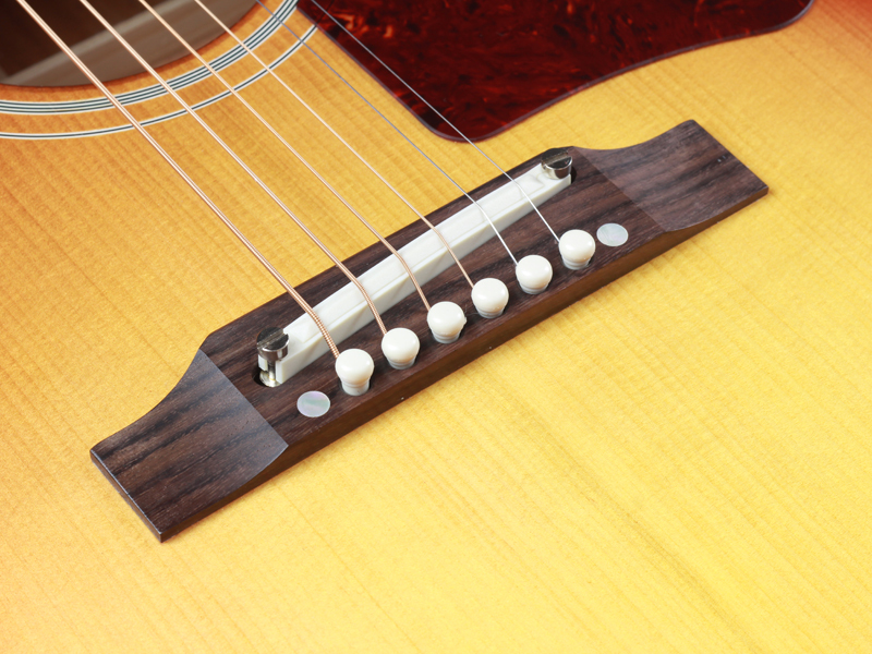 本器は60年代のJ-45のディテールを復刻したカスタムモデル。トップ材がアディロンダック・レッドスプルースにカスタマイズされており、ピックガードはラージでアジャスタブル・サドルという仕様です。