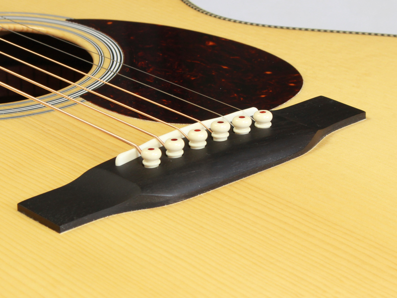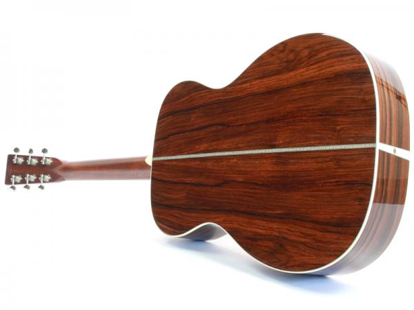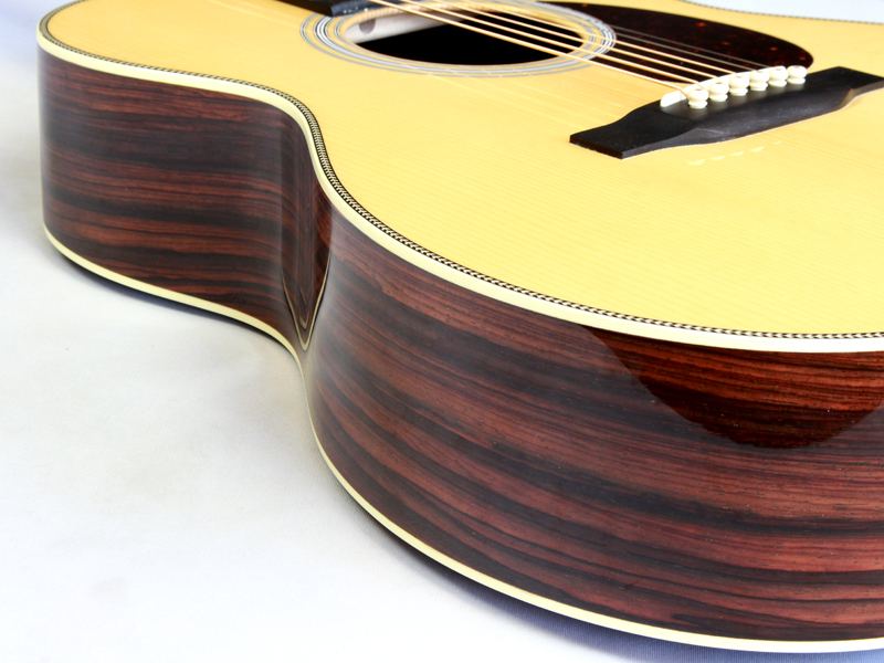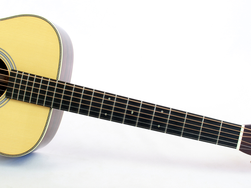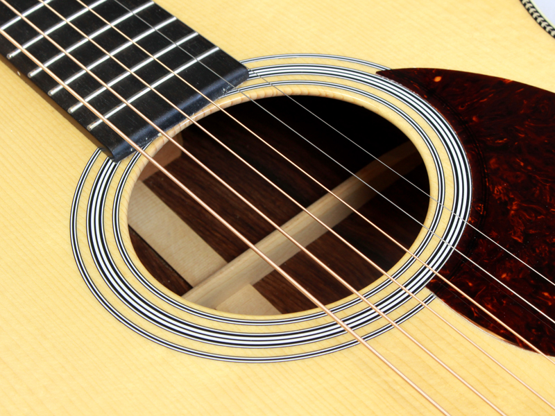 トップ材はアディロンダックスプルースのVTS仕様、アディロンダックスプルース材ブレーシング(フォワードシフトGEスタイル)、サイド&バック材は非常にワイルドなグアテマラ・ローズウッド、マホガニー材ネック、44.5mmナットにハイポジションまで滑らかな弾き心地のパフォーミングネック仕様、エボニー材ブリッジ&指板、ヘリンボーントリム&アイボロイド・バインディング、GEスタイルのオールドデカールロゴ、ジグザグバックストリップと、古き良きマーティンの伝統を守りながら、プレイアビリティを高めたデザインとなっています。