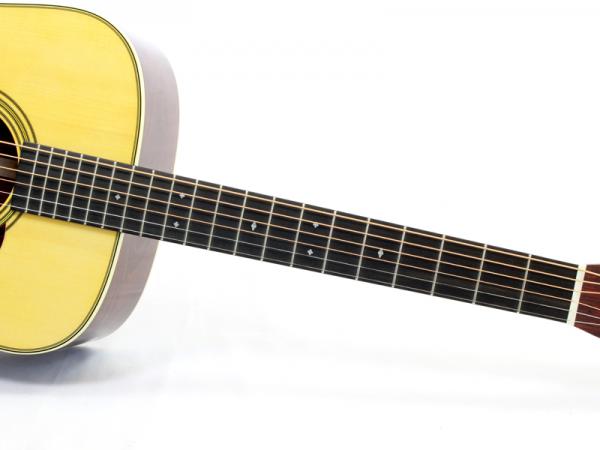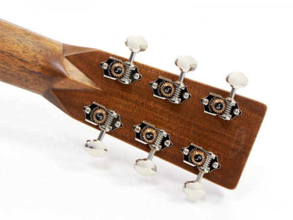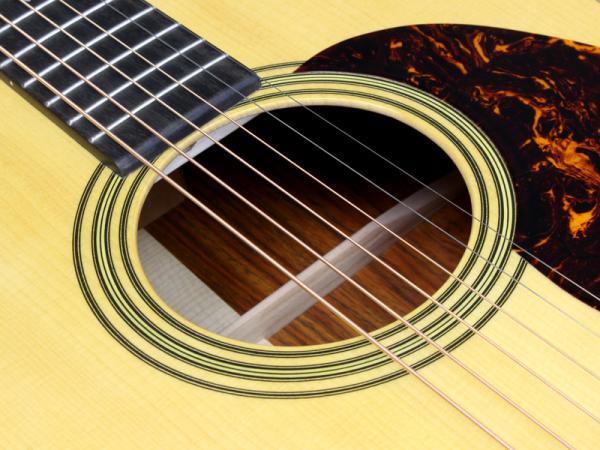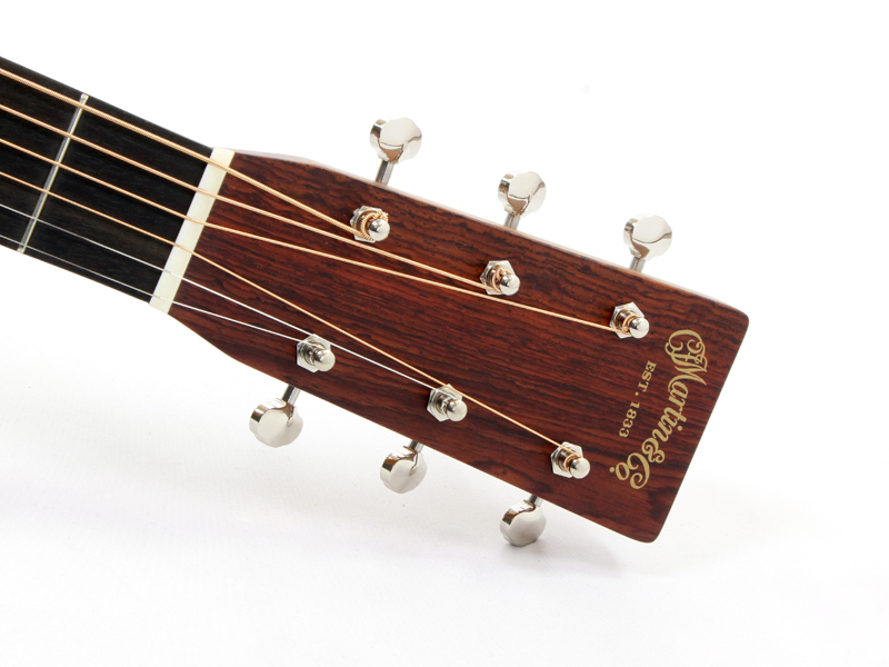 その他スペックとして、マホガニー材ネック、エボニー材指板&駒、アディロンダックスプルース材ブレイシング、ナット幅は44.5mmのMod Low Ovalネックシェイプ、MARTINオールドスタイル・デカール(オーセンティックスタイル)、ダイアモンド&スクエアー指板インレイ、Schaller Grand Tuneペグ、ココボロ材天神突板、ロングサドル仕様と、ヴィンテージディテール溢れるルックスに仕上がっております。