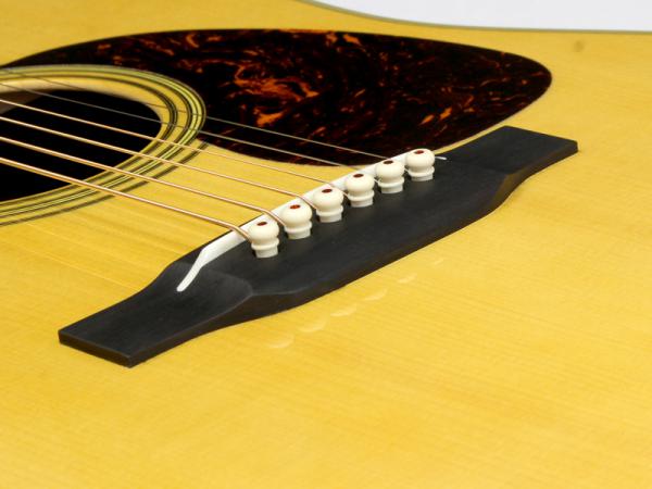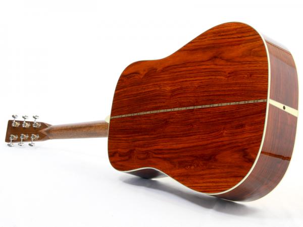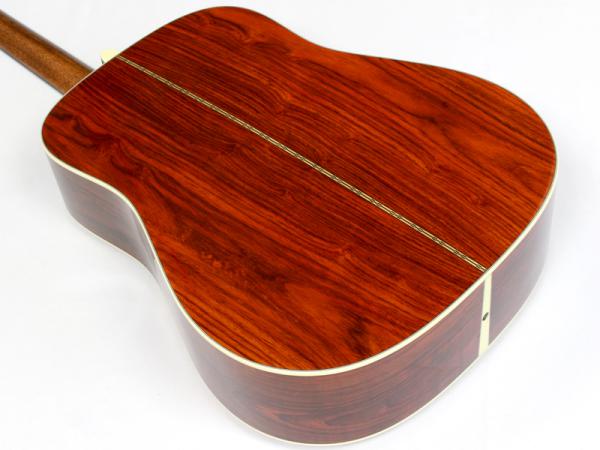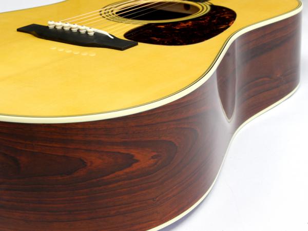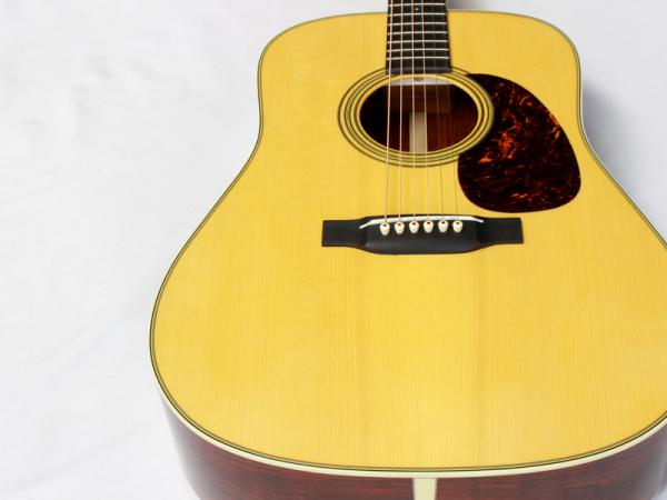 こちらは当店オーダーでカスタムさせて頂きました、アディロンダックスプルース材トップ、ココボロ材サイドバック仕様のD28。このギターにはなんと、今までAuthenticしか選択肢の無かったリアシフト・ブレーシングを採用しています。リアシフトにする事で音の芯をしっかりと出して、ココボロ材の特性で排気量を上げる、そんな「マーチンでパワーを求めたらどれぐらい応えてくれるギターが出来るのか?」をアイデアの根源にしてオーダーした1本となっており、結果としては期待通りの極太密度。ドレッドならではの魅力が目一杯詰まったサウンドに仕上がっています。