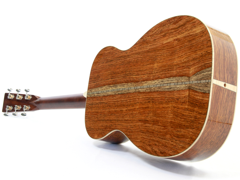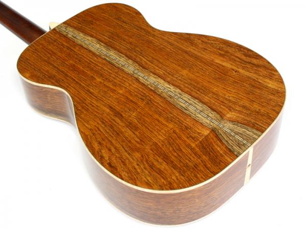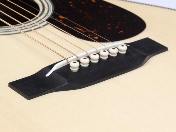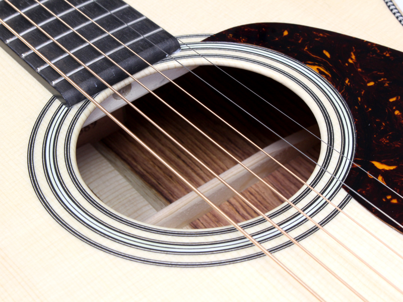 トップ材にはジャーマンスプルースの代替材として近年マーチン社が使用しているスイススプルースを採用。アメリカ産のスプルースに比べて立ち上がりが早く、きらびやかでキメの細かい倍音成分が特徴。豪快でパワフルな演奏よりは、音量に繊細でハイからローまでバランス良く聴かせたい演奏に向いていると言えます。サイド&バック材はサップイリのグアテマラローズですが、インドローズのようなモッタリとした感じがなく非常にクリアで素直な出音。マダガスカルよりもレスポンスは早く、甘い音色というよりは適度に硬質でハカランダのようなクリスタル感も感じられます。