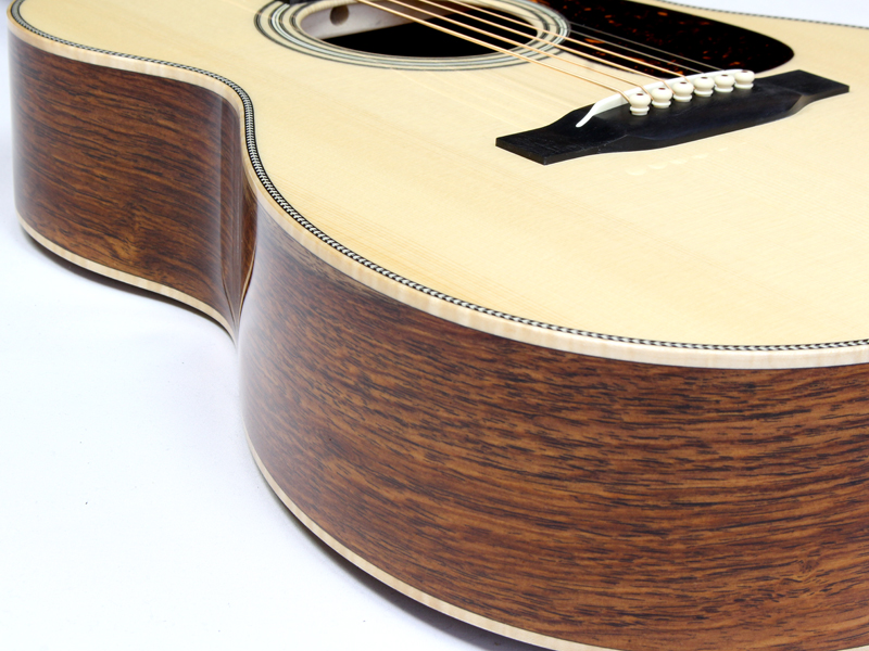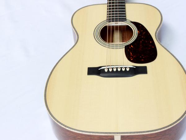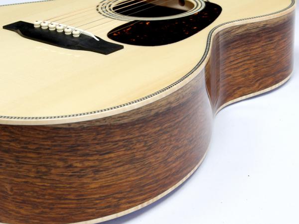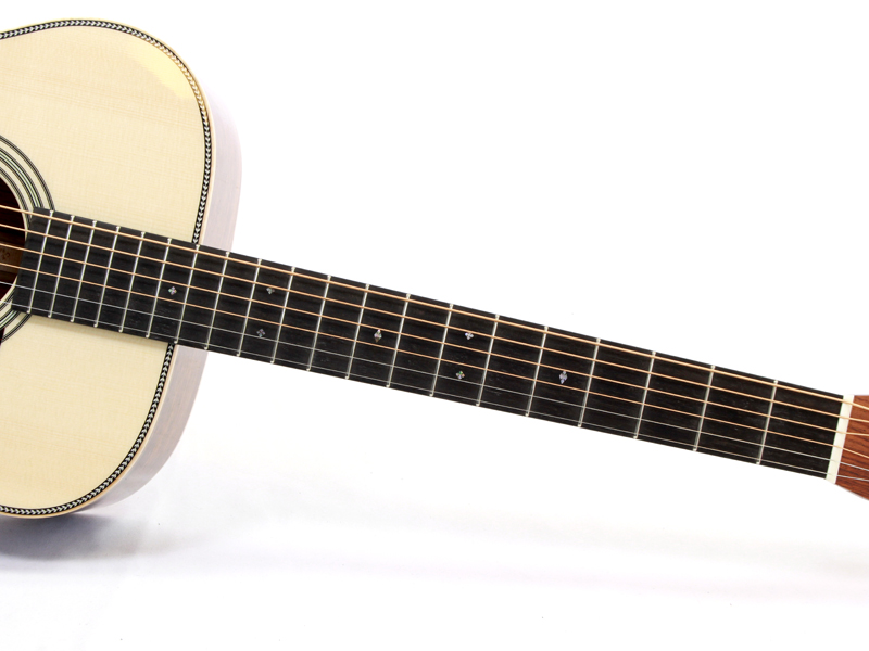 こちらは当店オーダーでカスタムさせて頂きました、スイススプルース材トップ、グアテマラローズウッド材サイド&バック仕様の00-28。00ボディで14Fジョイントのギターは需要はあるのですが商品としての選択肢はとても狭いので、この機会に必ず作りたいと思っていました。バインディング材にはフレイムメイプルを採用し、サウンド&ルックス共に端正で美しいギターを目指しました。