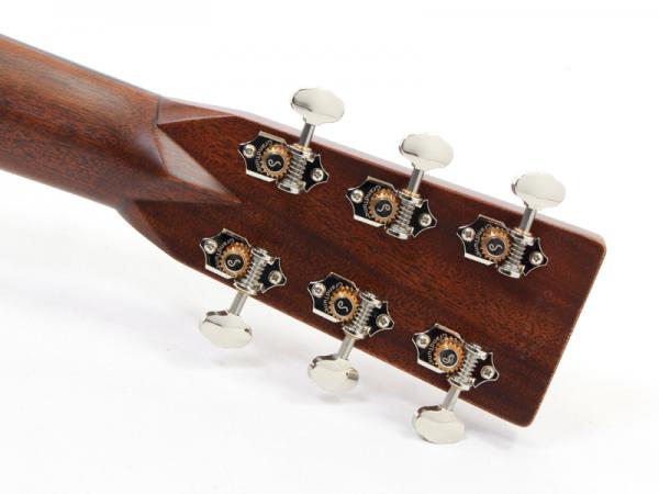 その他スペックとして、マホガニー材ネック、エボニー材指板&駒、アディロンダックスプルース材ブレイシング、ナット幅は44.5mmのMod Low Ovalネックシェイプ、MARTINオールドスタイル・デカール(オーセンティックスタイル)、ダイアモンド&スクエアー指板インレイ、Schaller Grand Tuneペグ、グアテマラローズ材天神突板、ロングサドル仕様と、ヴィンテージとモダンを融合させたセンスあるルックスに仕上がっております。