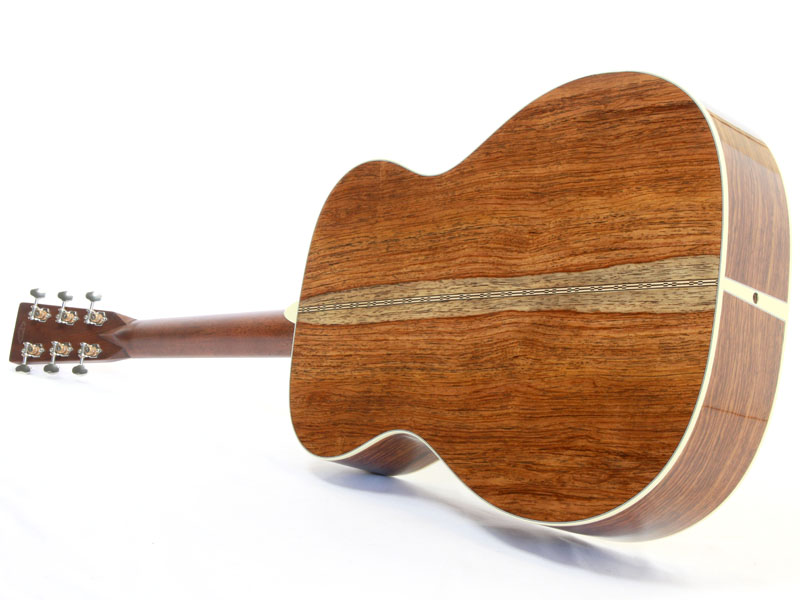 トップ材には大量のストックから厳選したアディロンダックスプルースをチョイス。サイド&バック材にはグアテマラローズウッド材を選定しました。グアテマラローズの良い所は、マダガスカルのように甘くならず、ココボロのように重くない所です。適度に硬質なクリスタル感はマーチンのサウンドと非常に良く合います。倍音感はたっぷりですが重苦しくなく、ギター全体の重量的にも非常に理想的に仕上がっております。