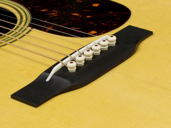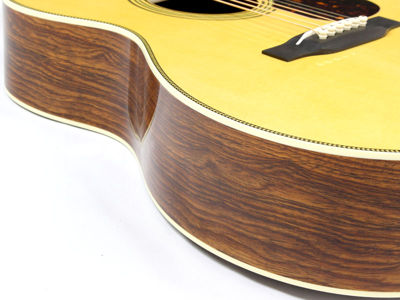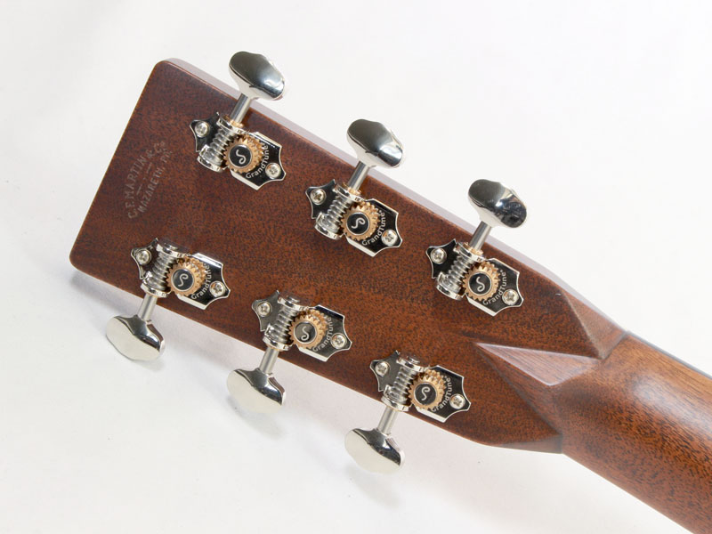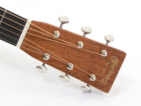 その他スペックとして、マホガニー材ネック、エボニー材指板&駒、アディロンダックスプルース材ブレイシング( Xブレイシング・GEスキャロップド)、ナット幅は44.5mmのロープロファイルネック、MARTINオールドスタイル・デカール(オーセンティックスタイル)、ヘリンボーントリム、ダイアモンド&スクエア指板インレイ、Schaller Grand Tuneペグ、グアテマラローズ材天神突板、ロングサドル、エイジングトナーフィニッシュと、ヴィンテージディテール溢れるルックスに仕上がっております。