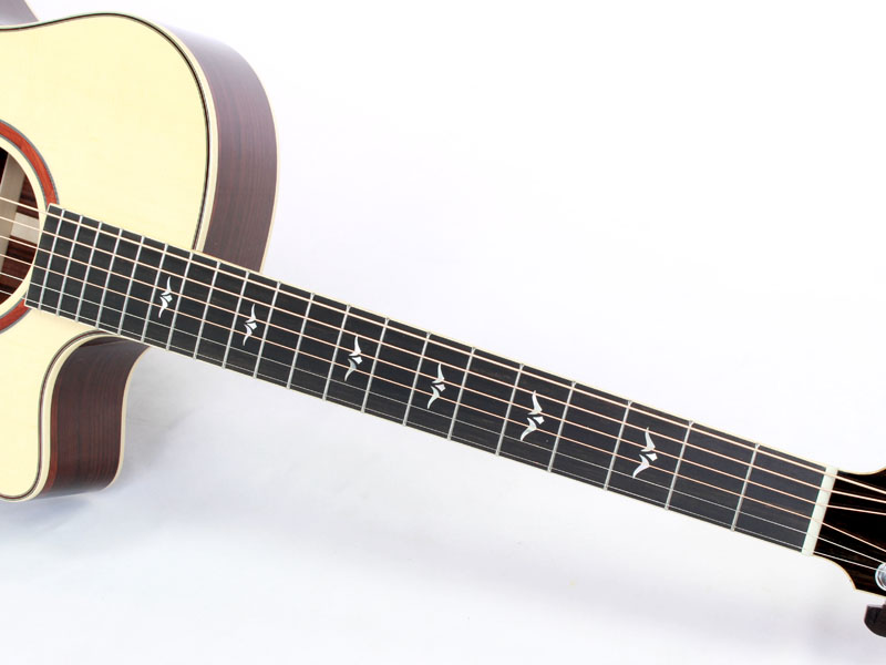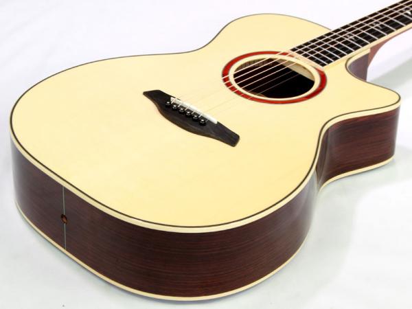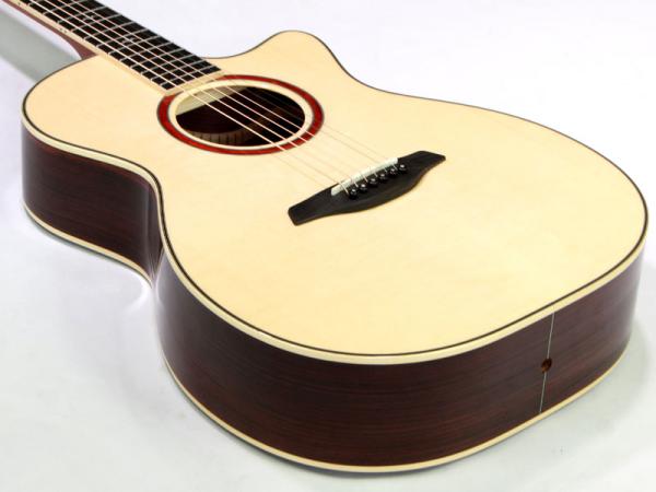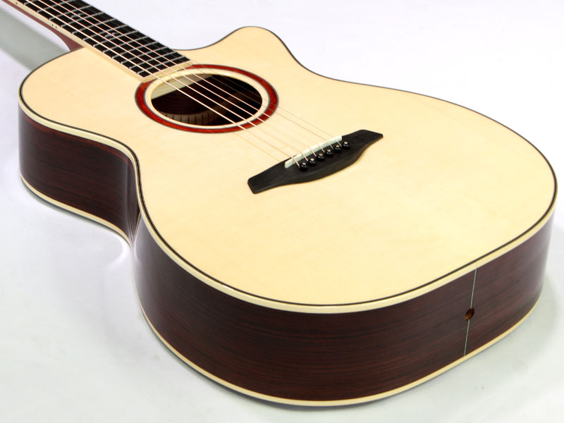 トップ材を上質なイングルマンスプルースにアップグレードしており、サイド&バック材にはインディアンローズウッド。フォルヒの魅力となっているシルキーで綿密な音色を更に引き出し、立ち上がりの早さだけでなく繊細さも兼ね備えた音色に仕上がっております。フィンガーピッキングに最適な立ち上がりの早いバランスの良い音色は絶品です。
