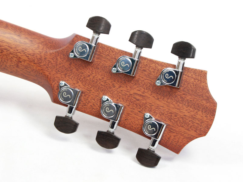 ルックスも非常に美しい仕上がりで、ボディ周り、ネック&ヘッドまでメイプル材でバインディングが巻かれており、パドゥック材による鮮やかなロゼッタ&パフリング、フラワー指板インレイ、シャーラー製ペグでエボニーボタンと、纏まりのある上質な仕上がりとなっております。
