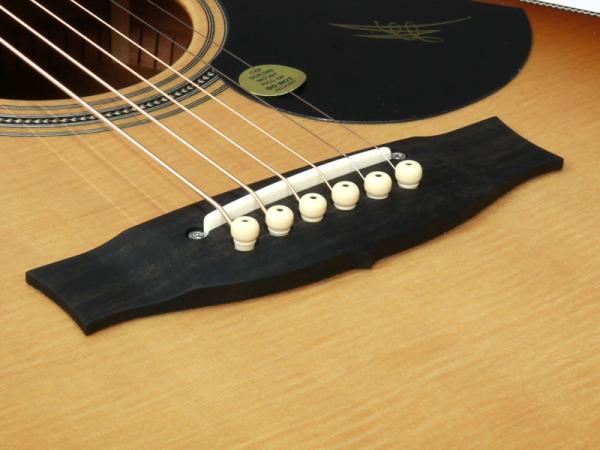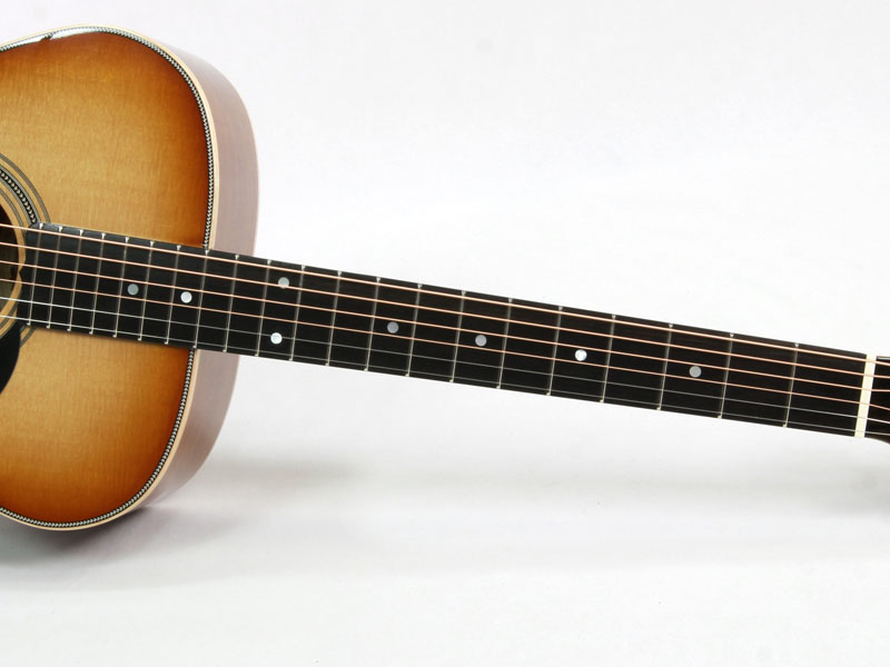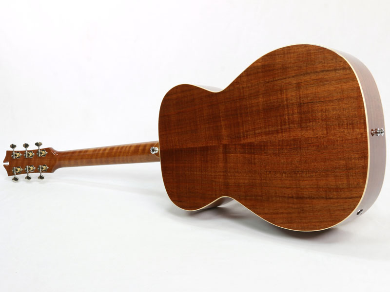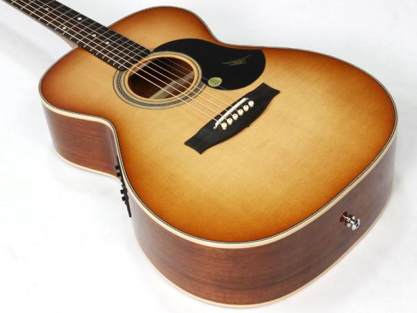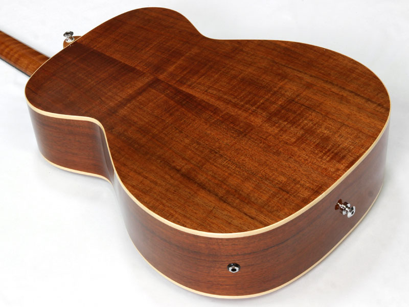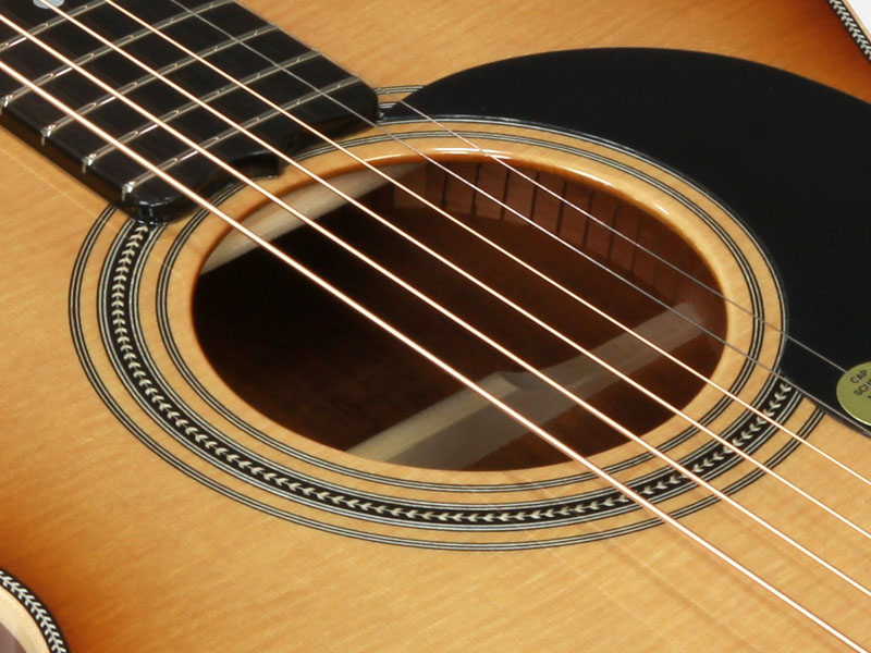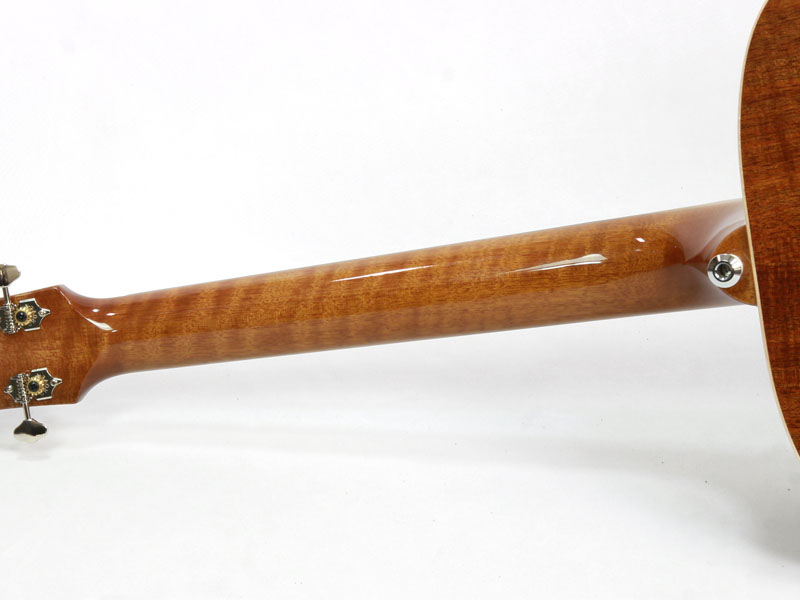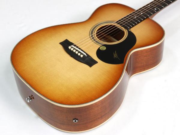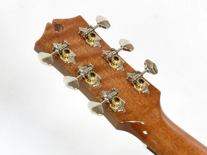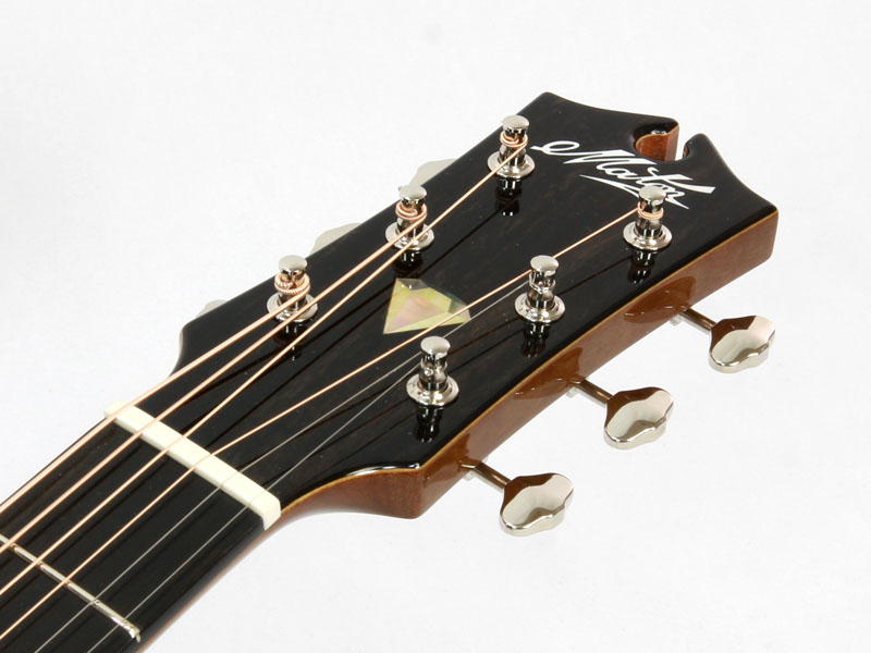トップ材はAAA シトカスプルース、サイド&バックにはフィギュアード・オーストラリアン・ブラックウッド材を採用した贅沢なスペック。ネック材はトミー・エマニュエルのモデルなどと同じくクイーンズランドメイプル材が使われ、その中でもフィギュアードの入ったものがチョイスされているという拘りぶりです。メイトンでは珍しいオール・グロスフィニッシュ、そして非常に印象的なダイアモンドを模したインレイがヘッドを飾ります。