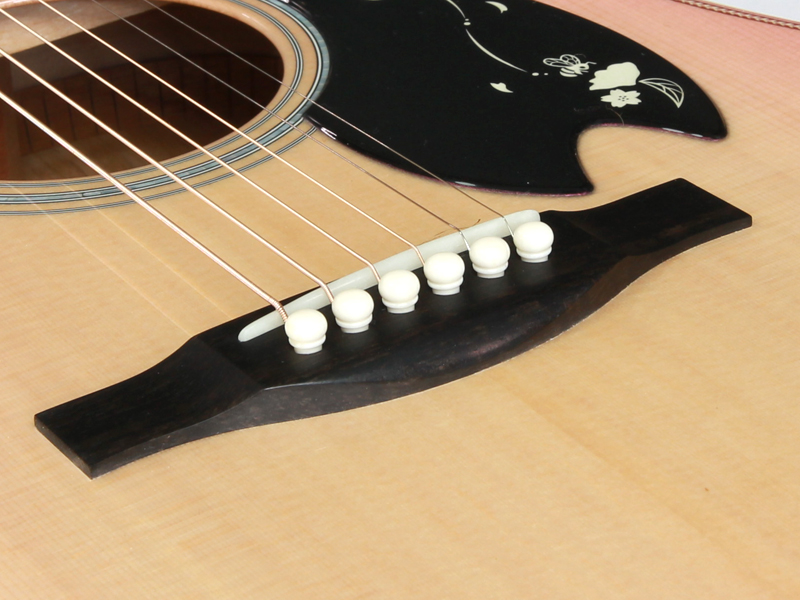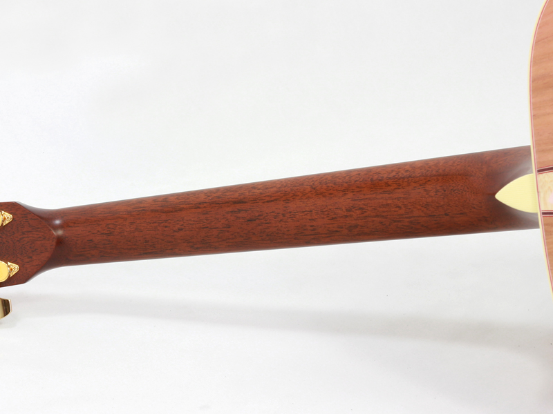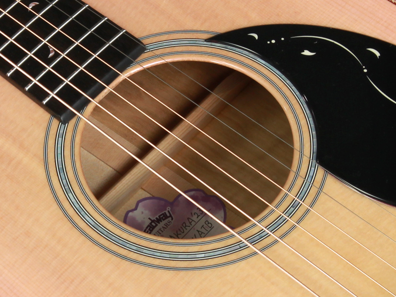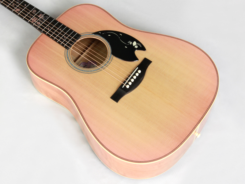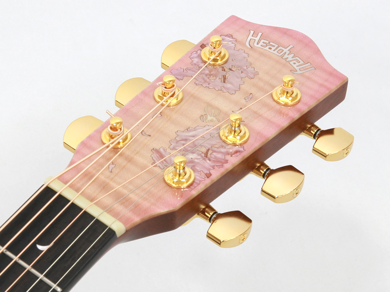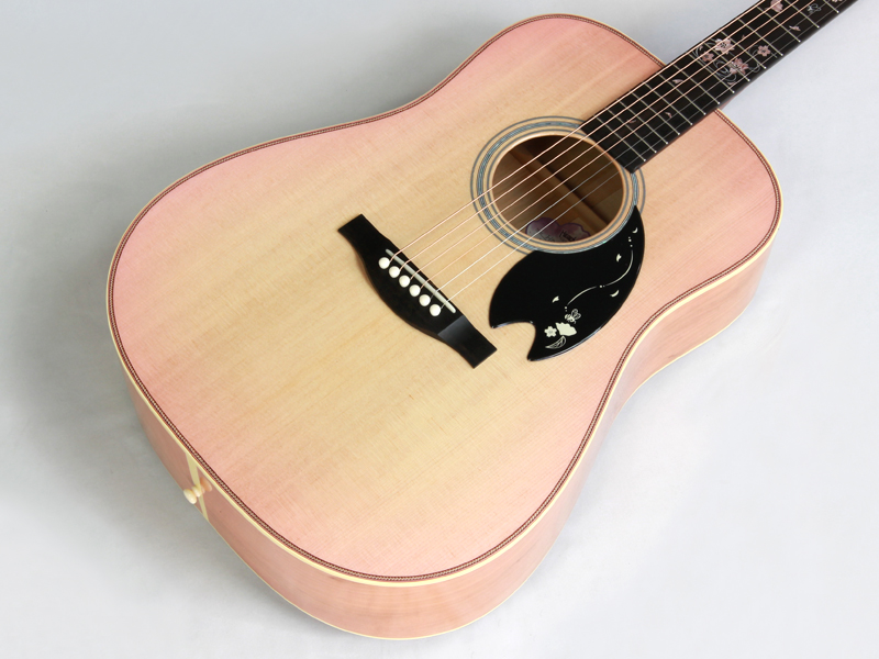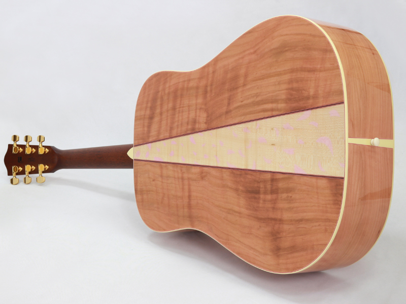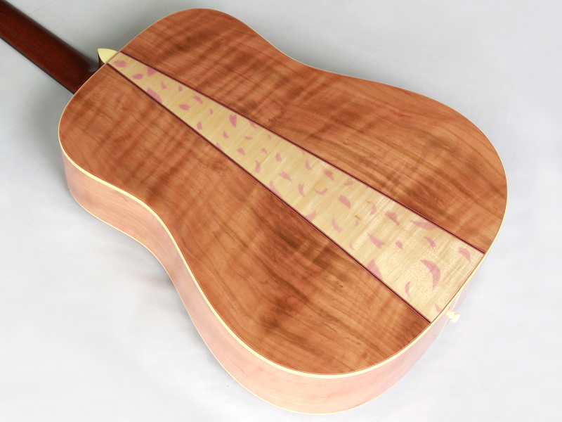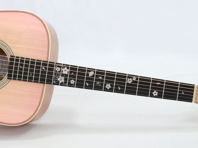 ボディトップ材には厳選されたシトカスプルース、バック材には桜と楓を組み合わせた3Pバック構造となっております。センター部分の楓の全面を覆うように桜の花びらが舞っている風景を塗装にて表現しております。サウンド的にも楓を挟み込みことで、楓特有のキレのある歯切れの良さが加わります。