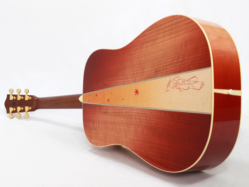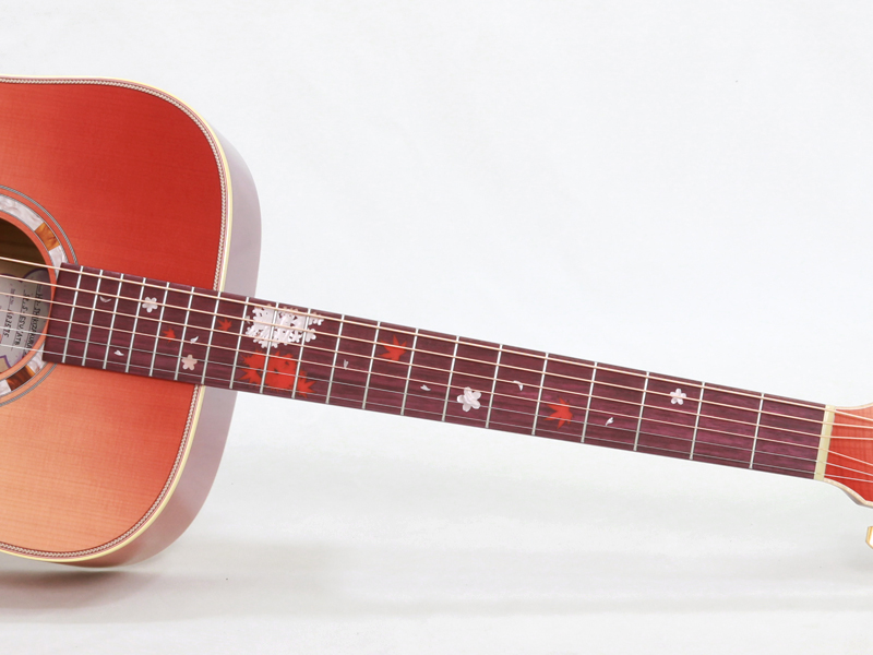 今年の仕様は斜め方向に変化をつけたグラデーションカラーは本機の最大の特徴です。小原の四季桜の風景からインスピレーションを受け、ボディ全体で桜と紅葉が咲き誇る様子を表現しています。また、センターの楓材にのみ夕日をイメージした橙色のグラデーションカラーを塗り分けており、和服の女性のデザインとともに物語性を感じさせてくれます。