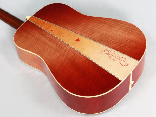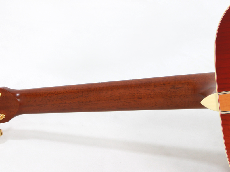 ボディサイド&バックには、フレイム杢が際立つ和材の山桜を使用。本機は3P構造となっており、センター材には同じく和材の楓を採用しております。どちらも比較的硬くしっかりした材質であり、山桜特有の少し甘さを感じるサウンドに楓が持つスッキリとしたキレのあるトーンがエッセンスとして加わることで、軽いタッチから甘く爽やかに鳴る印象的なサウンドに仕上がっています。