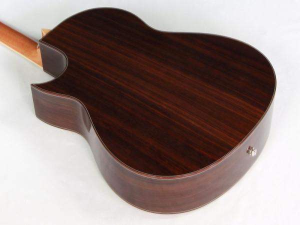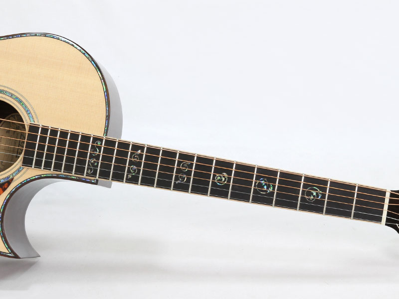 インディアンローズウッド材のボディバインディングやアバロン・ロゼッタ、メイプル・フレットボードバインディング、各所に多数のインレイを施し、グロスUVフィニッシュで仕上げられ、非常に高級感ある雰囲気に仕上がっております。