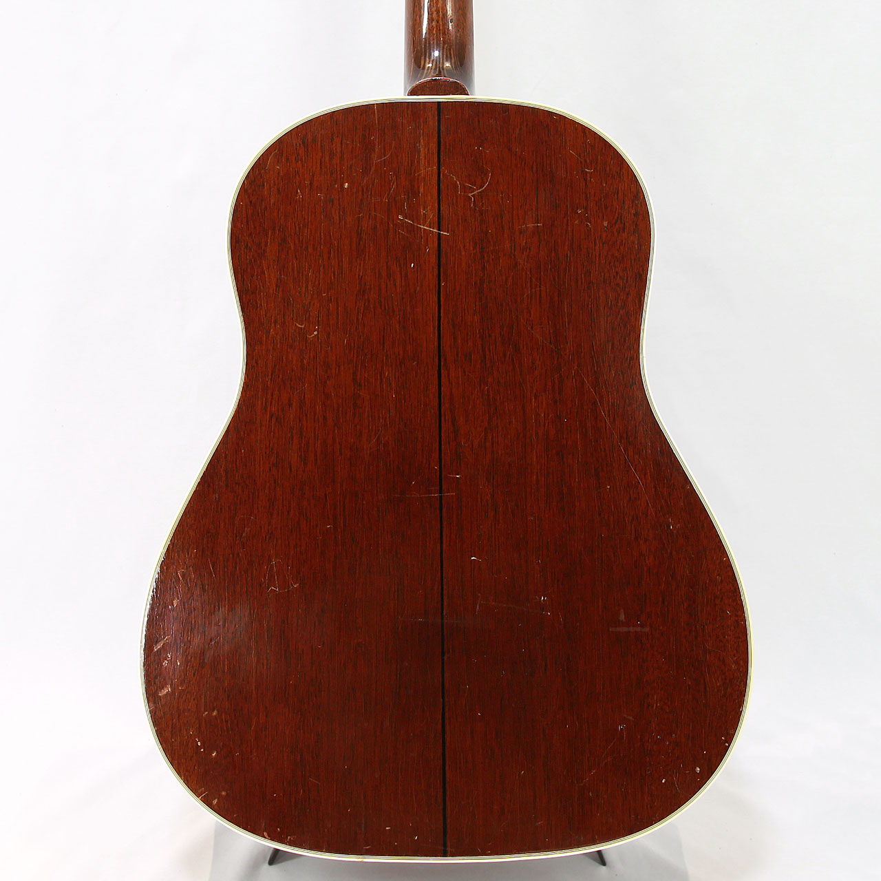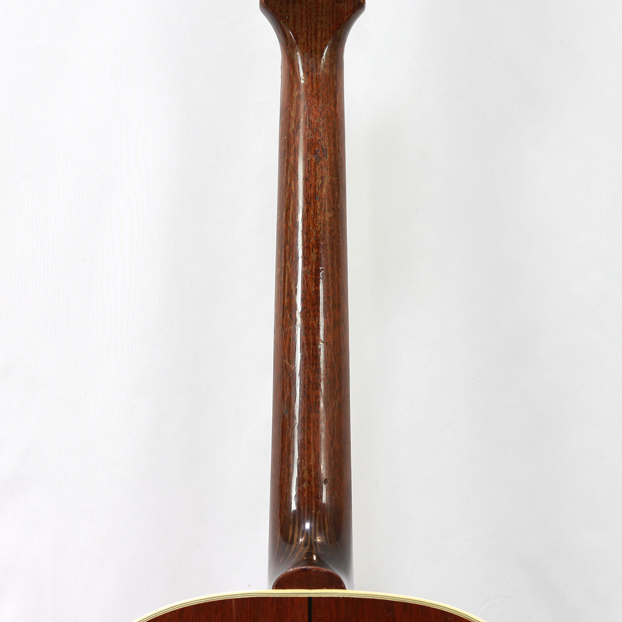 ボディは全体にウェザーチェック多めで、非常に雰囲気のある外観となっております。正面から見てサウンドホール右上、指板端とピックガードの境目にクラックの補修歴がありまして、中から長方形のパッチで補修済み。バック面はネックジョイントすぐ下のセンターストリップ脇に縦に約8cm程のクラックがあり、内部からグルーで補修されております。
