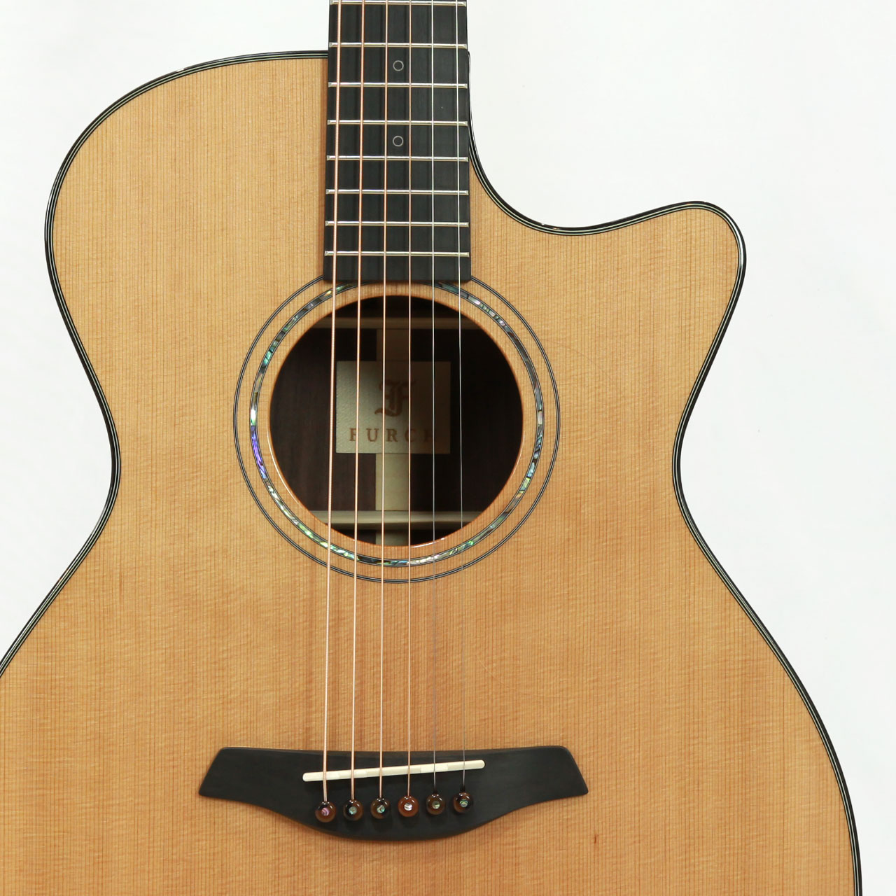 トップ材にはフォルヒらしい落ち着いた音色のシダー材、サイドバックはインディアンローズウッドの組み合わせで、全域でクリアで柔らかなサウンドを、素早いレスポンスと繊細なフィンガーニュアンスでコントロール可能となっており、元気でダイナミックなサウンドのアメリカ製のギターとは違う、ヨーロピアンなフォルヒギターならではの落ち着きが十二分に感じられる仕上がりとなっております。