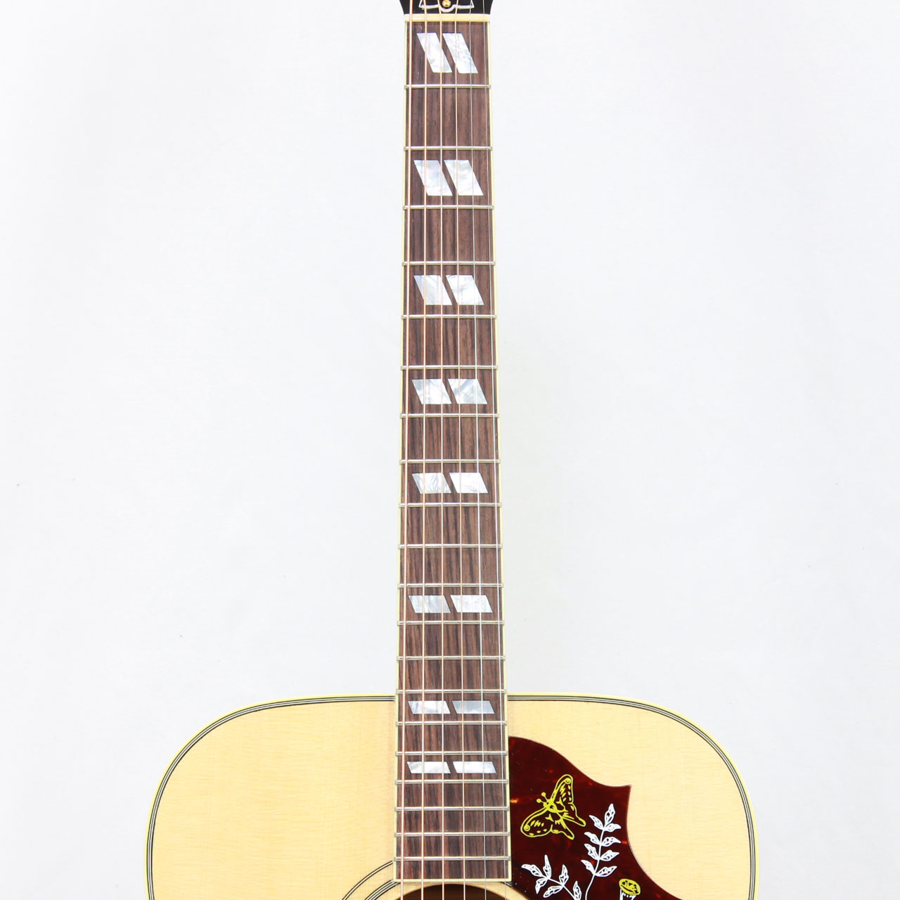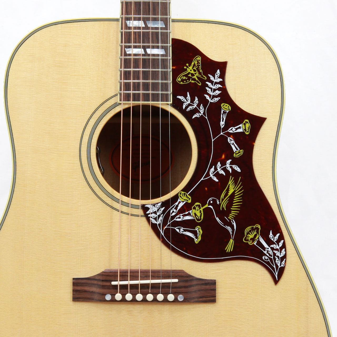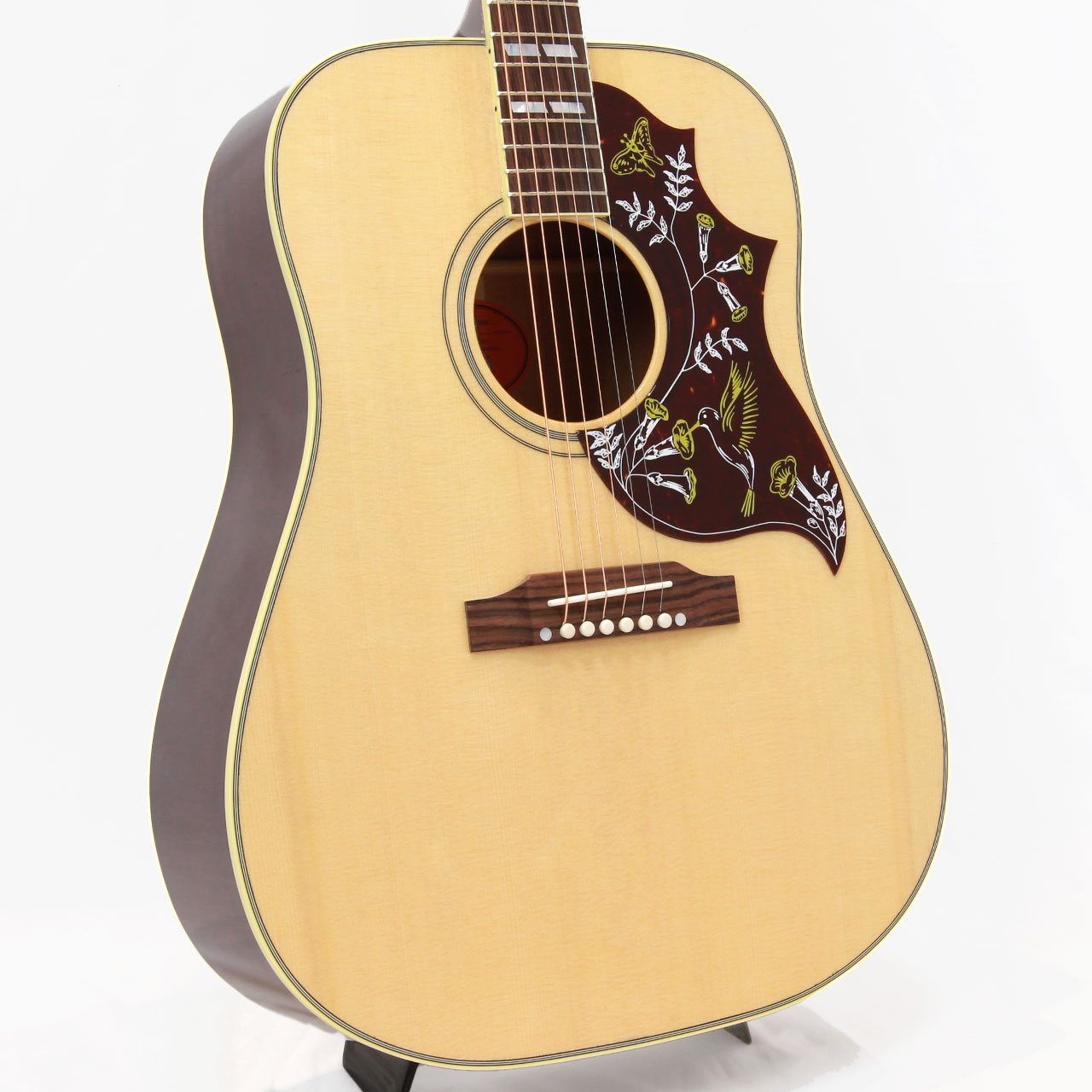 固定サドルですのであまりジャキジャキせず、フィンガーでもストロークでもバランス良く鳴ってくれます。ヘッドにはクラウンを、また指板のインレイにはダブルパラレログラムインレイを採用。そしてなんといってもハミングバード特有のこの特徴的なピックガードがたまりません。サウンド、ルックスどれをとってもギブソンアコギでは一、二を争う人気機種です。