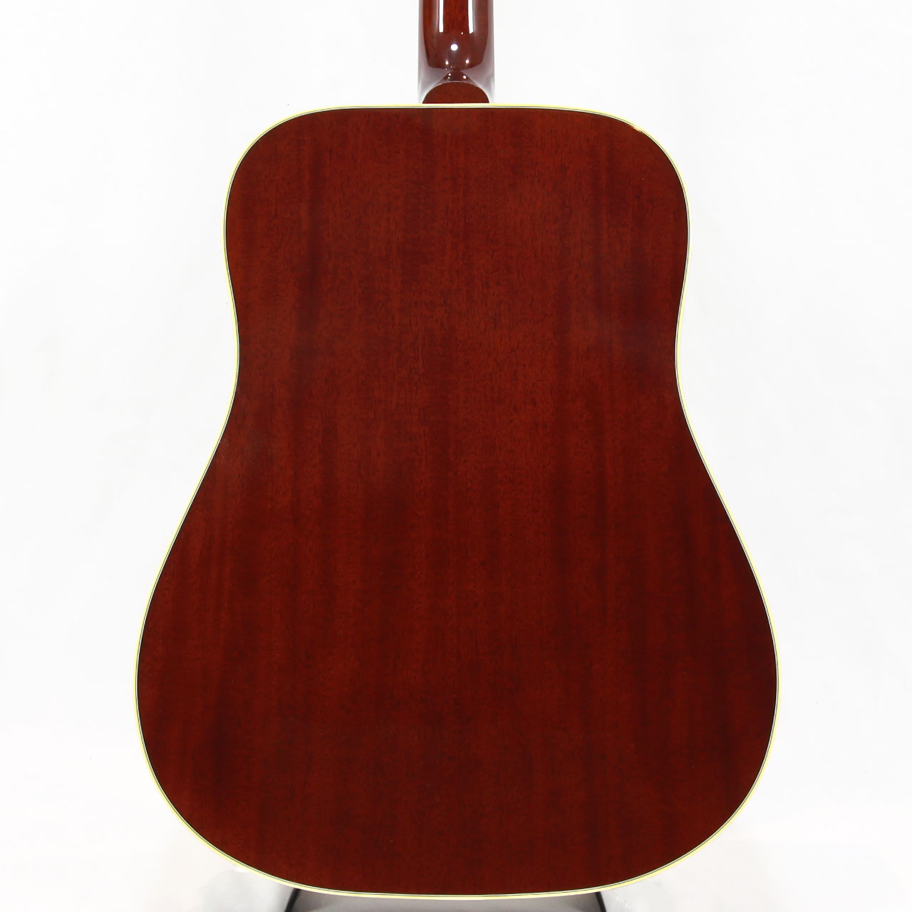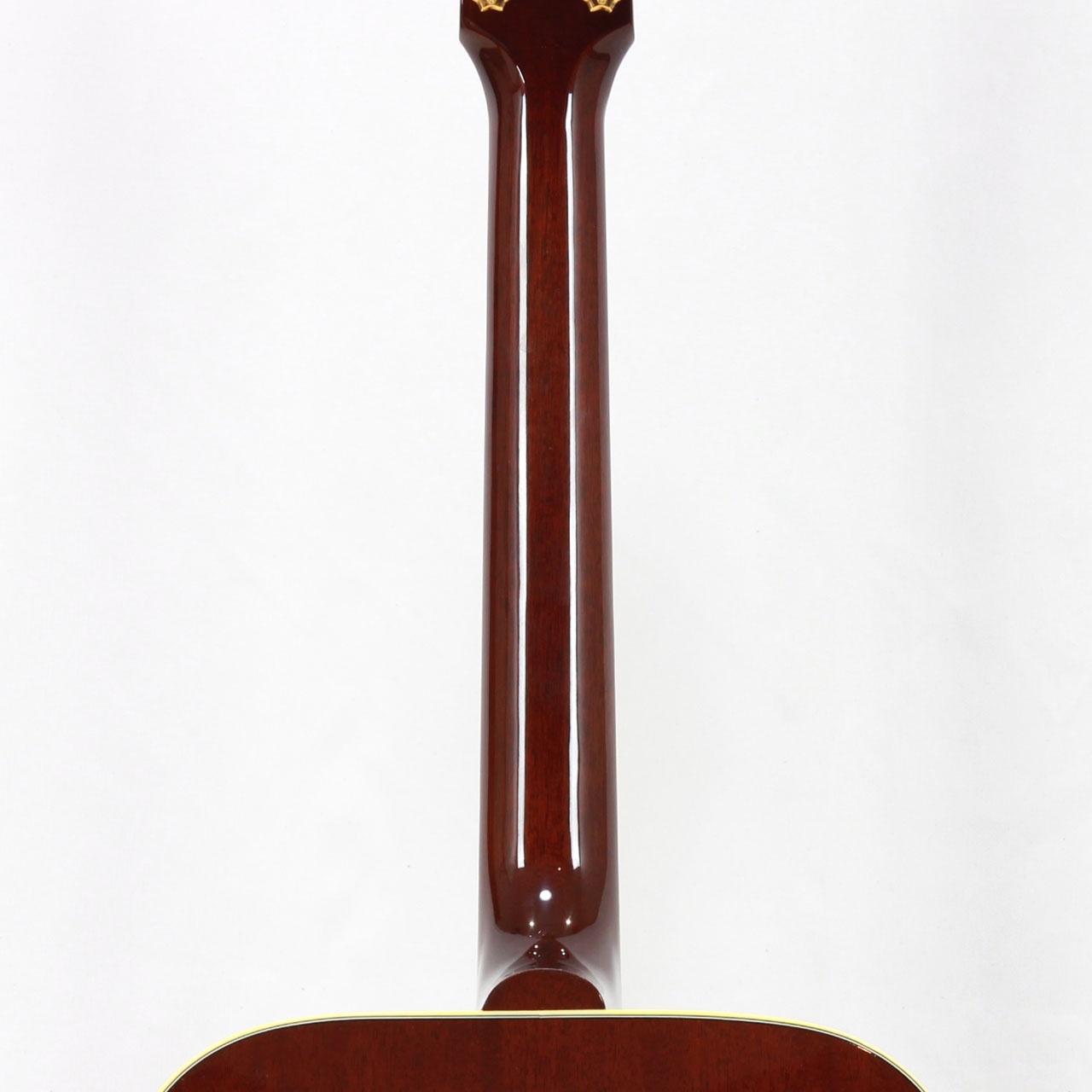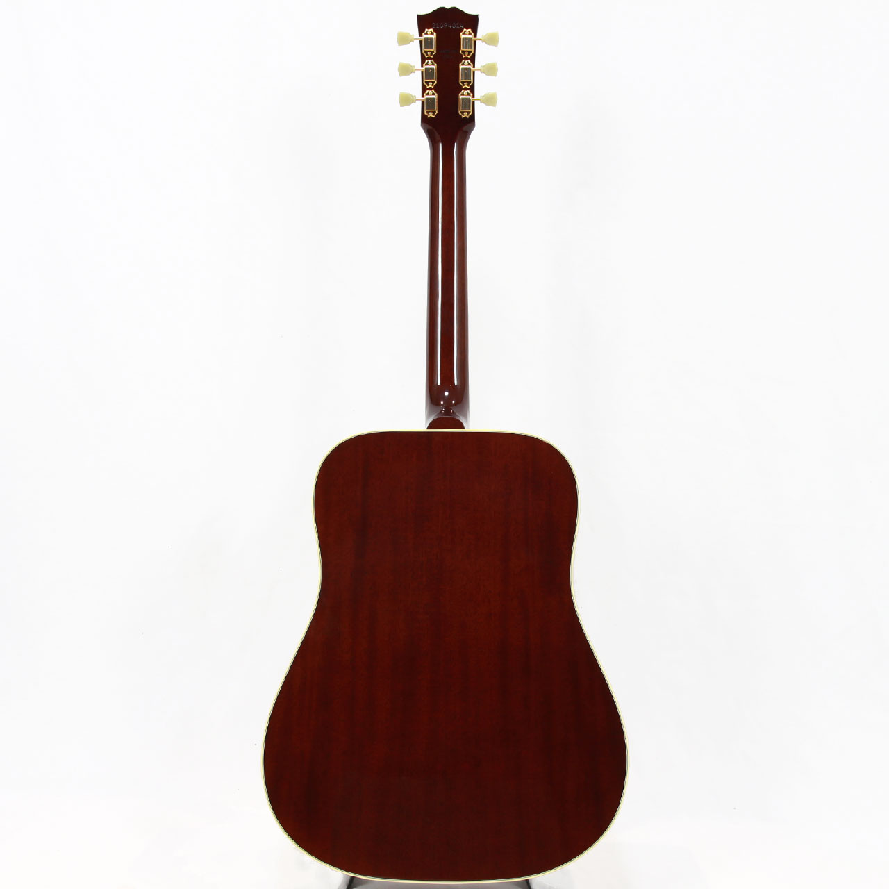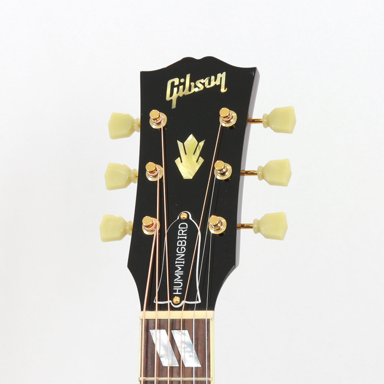 固定サドルですのであまりジャキジャキせず、フィンガーでもストロークでもバランス良く鳴ってくれます。ヘッドにはクラウンを、また指板のインレイにはダブルパラレログラムインレイを採用。そしてなんといってもハミングバード特有のこの特徴的なピックガードがたまりません。サウンド、ルックスどれをとってもギブソンアコギでは一、二を争う人気機種です。