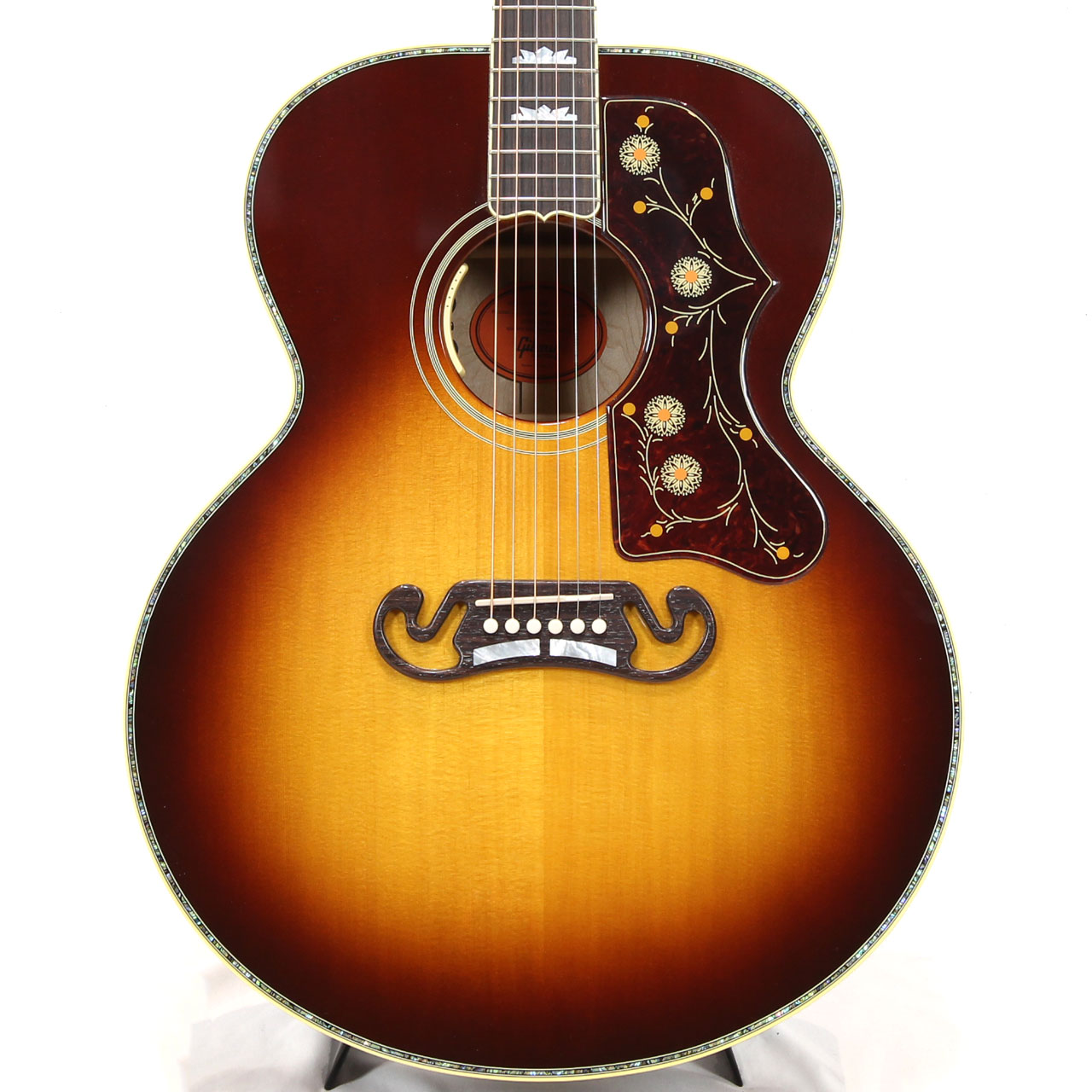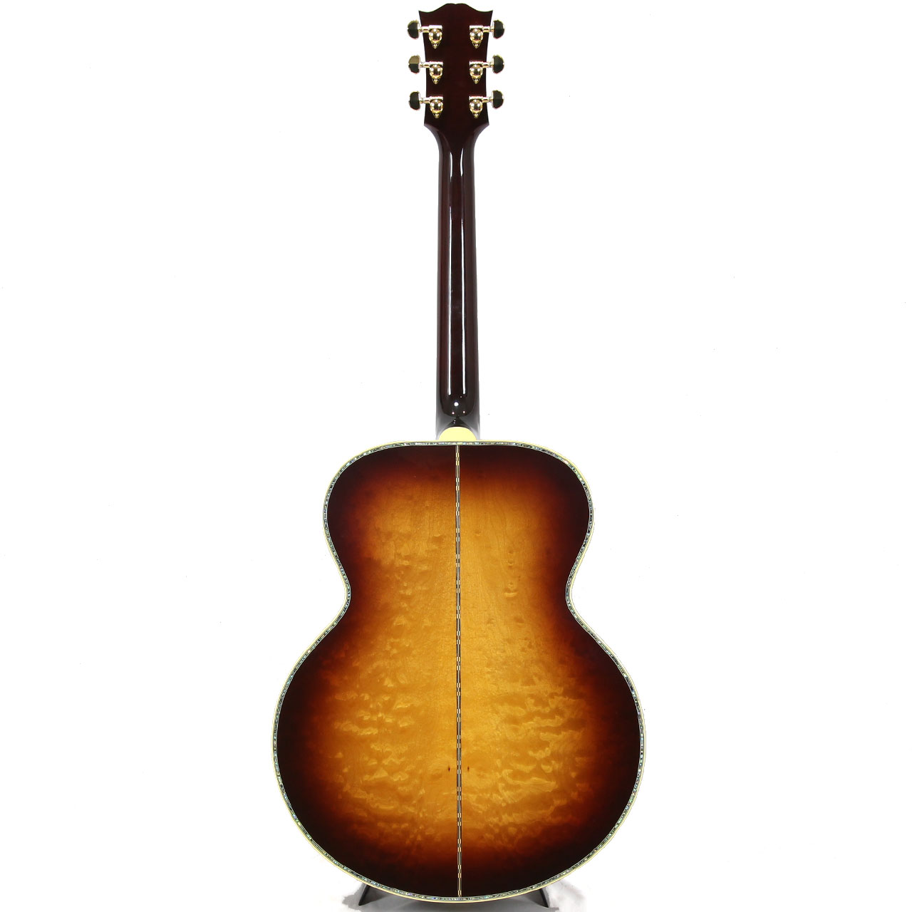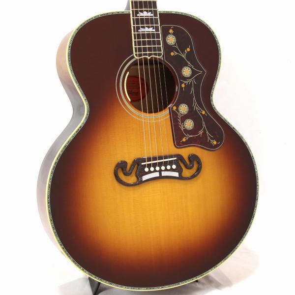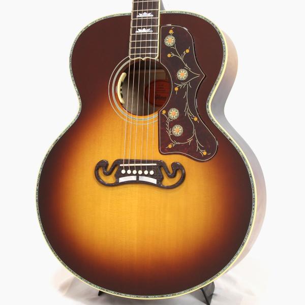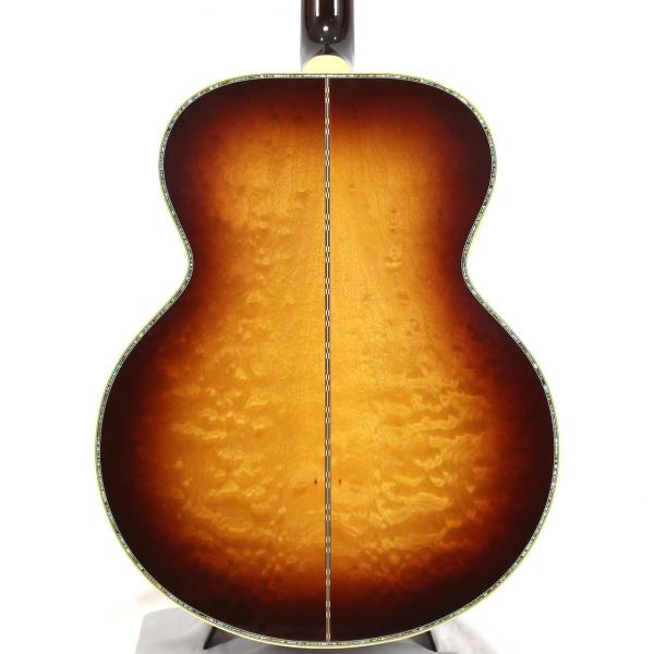 本器は2024年8月に当店アコースティックギター担当者がアメリカはモンタナ州ボーズマンにあるGibsonモンタナ工場に赴き、現地選定したスペシャルモデル。SJ-200 Standardをベースとしながら、レアなキルト・メイプル材をサイドバックに使用し、トップ面とバック面のトリムにアヴァロンのラインを採用した非常に豪華なモデルとなります。カラーリングはSJ-200 Deluxeでも採用された美しいRosewood Burstとなっております。
