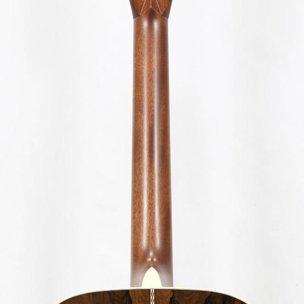 サイド&バック材のジリコテは、当店も2023年オーダー分で初めてオーダーする木材。2022年にマーチン社を訪れた際に木材担当者より少量ながら非常に良いジリコテ材が入荷していることを聞いていたので、2023年時には必ずオーダーしようと決めていました。こちらのジリコテ材は通常だと45に使用するクオリティですが、特別に選定させて頂きました。サウンドは非常にパワーが有り硬質で、ドンシャリ系の音色です。本器では特に高域の硬さと迫力あるローミッドのコントラストを楽しんでいただける1本に仕上がっております。