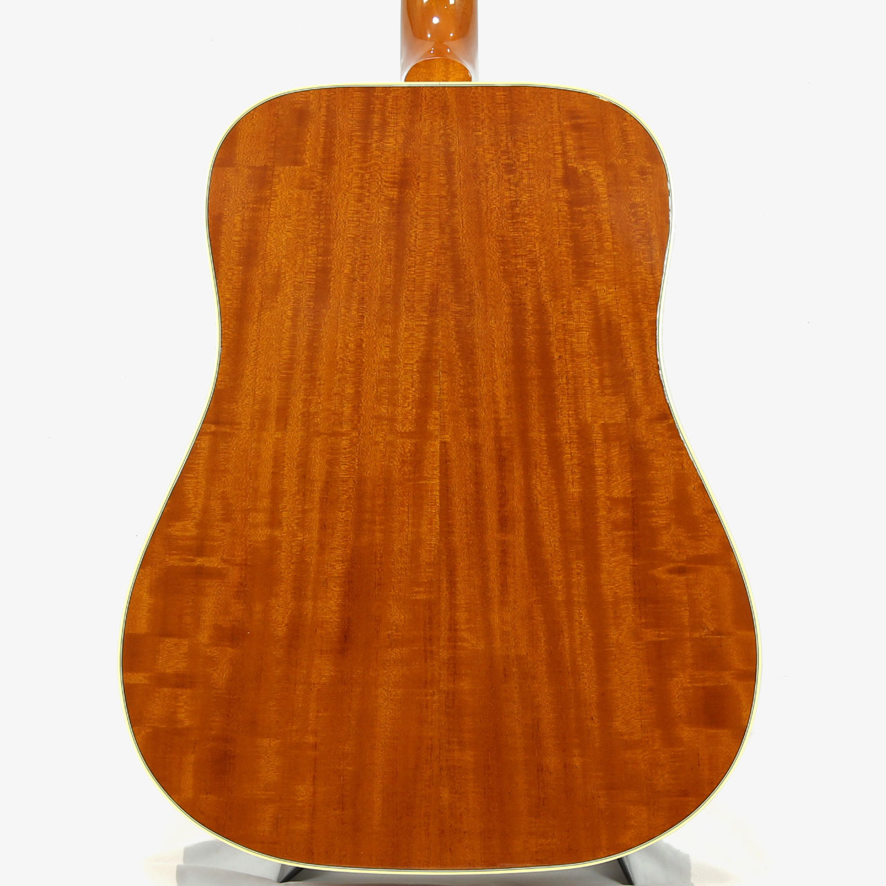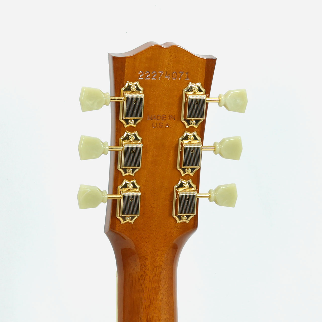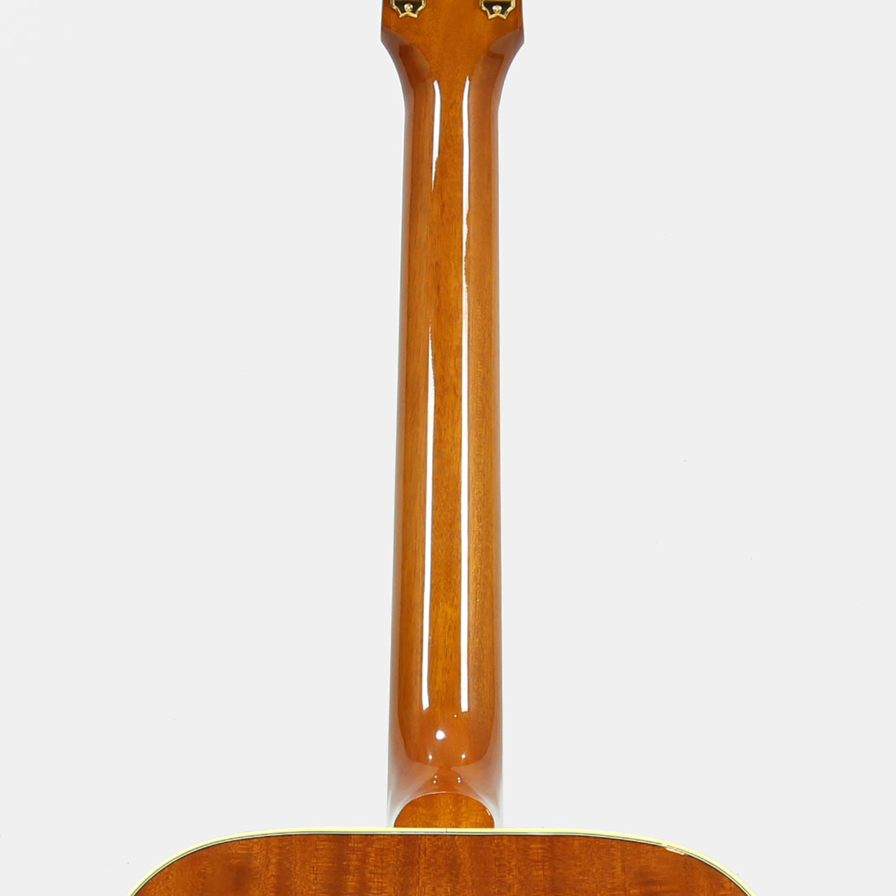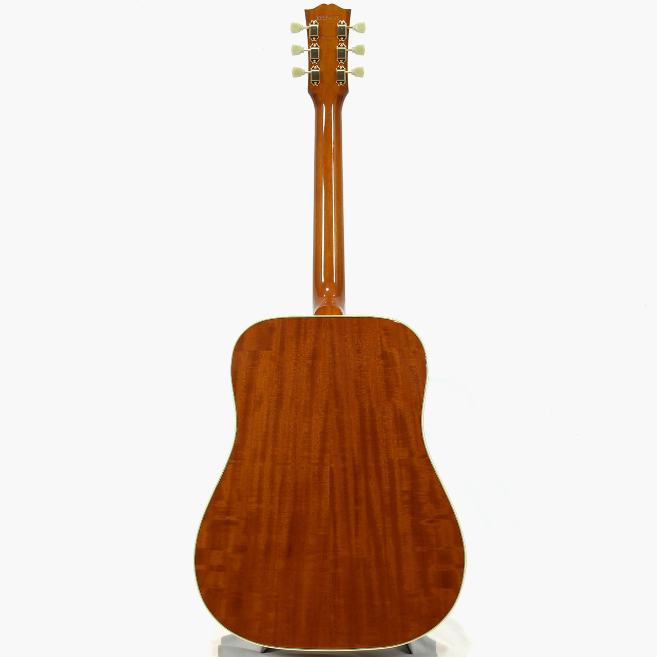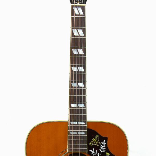 固定サドルですのであまりジャキジャキせず、フィンガーでもストロークでもバランス良く鳴ってくれます。ヘッドにはクラウンを、また指板のインレイにはダブルパラレログラムインレイを採用。そしてなんといってもハミングバード特有のこの特徴的なピックガードがたまりません。サウンド、ルックスどれをとってもギブソンアコギでは一、二を争う人気機種です。