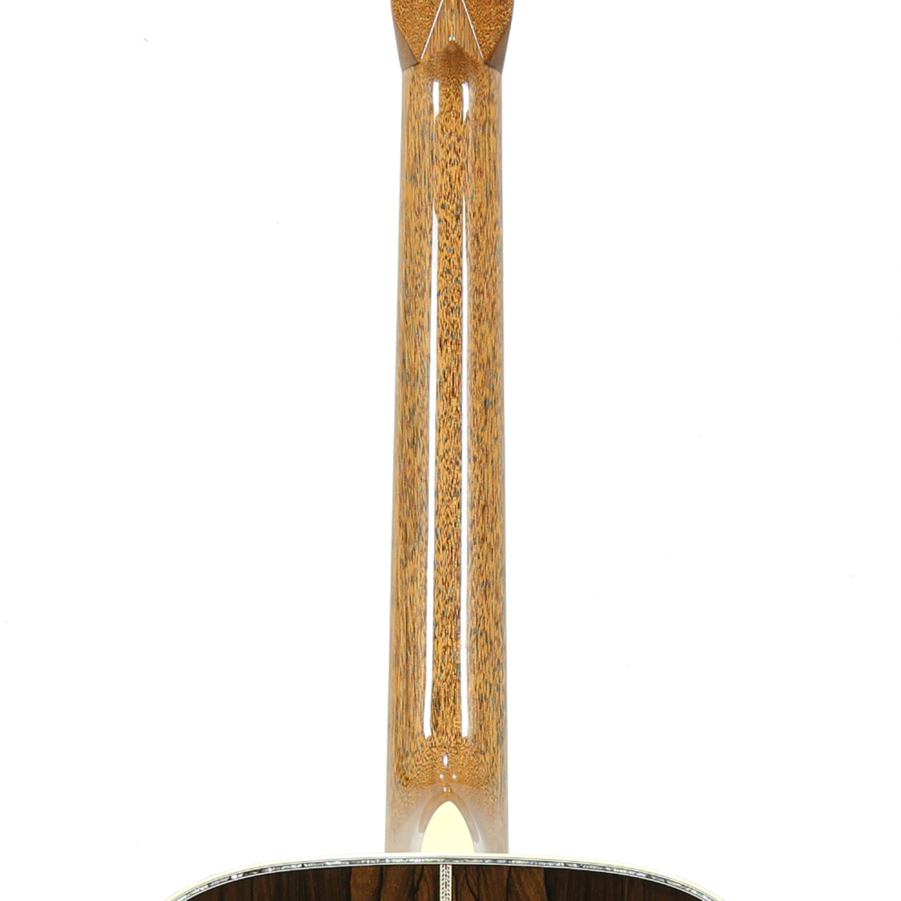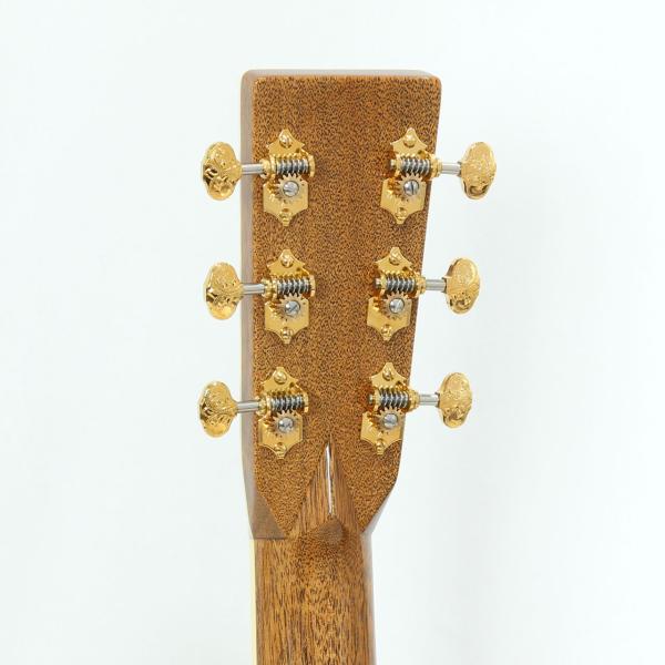 その他スペックも細部に渡って拘らせて頂いており、マホガニー材ネック、ブラックエボニー材指板&駒、アディロンダックスプルース材ブレイシング(ゴールデンエラ・スキャロップ※通常のスキャロップよりも更に細部に渡って削りが入ります)、ナット幅は敢えて44.5mmのModified Low Ovalプロファイルネック、45スタイル・スノーフレイク指板インレイ、豪華な彫金入りのWaverly 4062ペグ、ドロップインタイプのロングサドル、ヘッドストックも角を丸めた30年代スタイルを採用し、戦前のマーチンギターに近づけたルックス、仕様を意識しながらも、ワンオフオーダー物ならではの拘りも入れさせて頂きました。