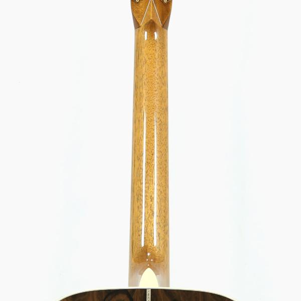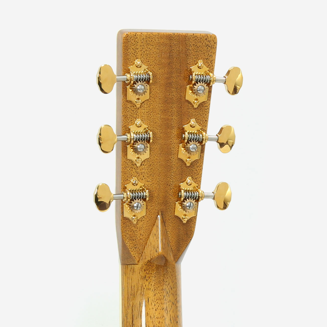 その他詳細な変更点、マホガニー材ネック、ブラックエボニー材指板&駒、アディロンダックスプルース材ブレイシング(ゴールデンエラ・スキャロップ※通常のスキャロップよりも更に細部に渡って削りが入ります)、ナット幅44.5mmのModified Low Ovalプロファイルネック、ゴールデンエラのスタイルの縦ロゴ、45スタイル・スノーフレイク指板インレイ、ブリッジの両脇には6ポイントのスノーフレイクインレイ、Waverly 4060ゴールドペグ、ドロップインタイプのロングサドル、ヘッドストックも角を丸めた30年代スタイルを採用し、ピックガード形状もオーセンティックスタイルと、戦前のマーチンギターに近づけたルックス、仕様になるようオーダーしております。