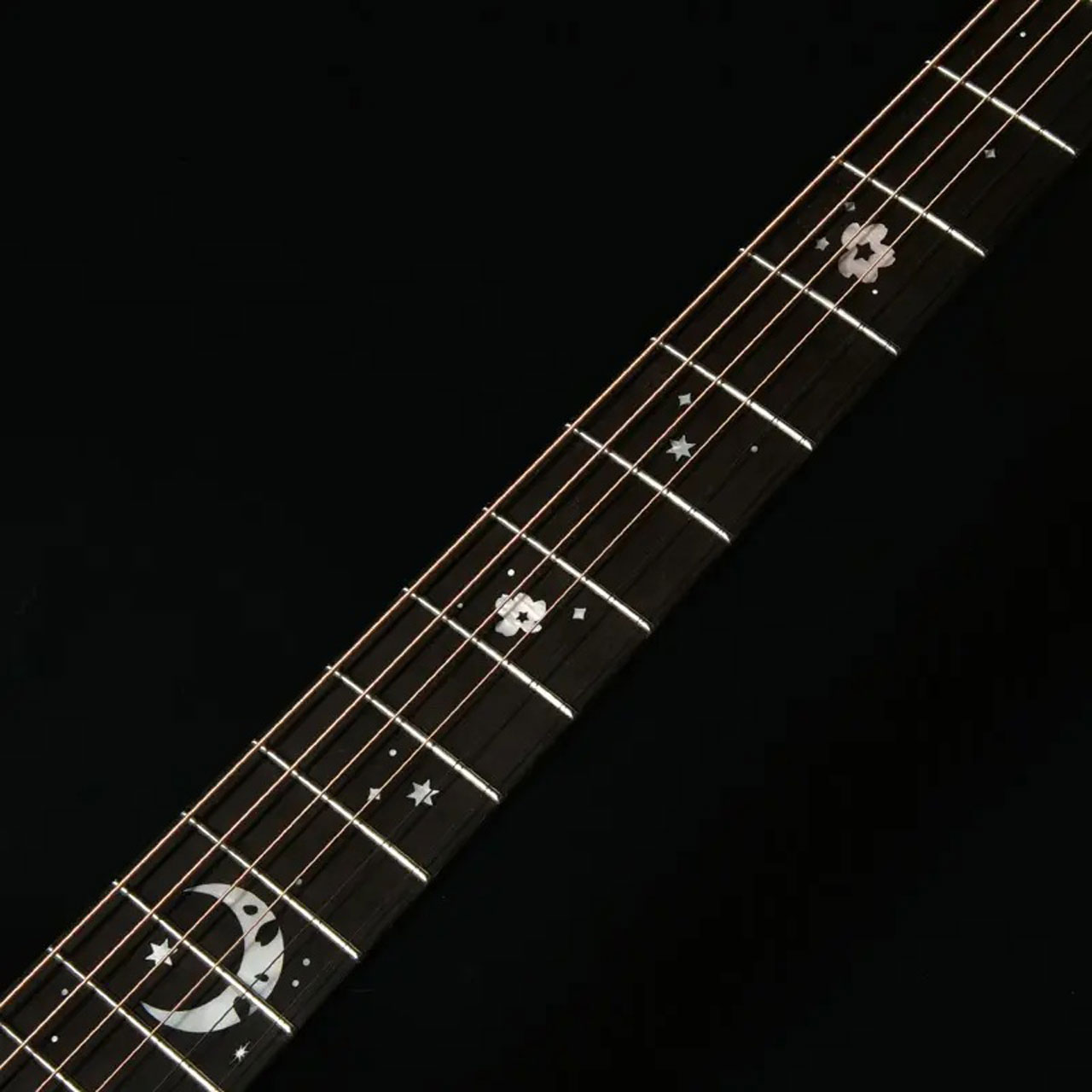 さらに指板にも桜と星が散りばめられています。指板材には黒々とした高級感のあるルックスでおなじみのエボニー材を採用。定番のローズウッドなどに比べて重量があり、音の立ち上がりが早く輪郭のあるトーンと伸びやかなサスティーンを生み出します。
