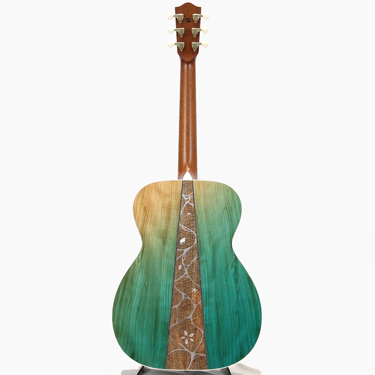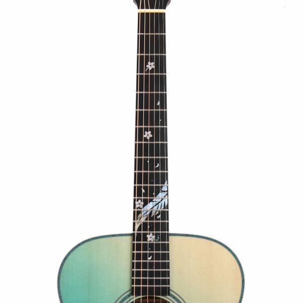 また、不死鳥を想起させるこのテーマに合わせ、指板インレイには羽とも葉とも取れる大胆なモチーフをあしらい、ギター全体のアクセントとして印象的な存在感を放っています。