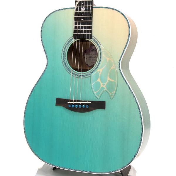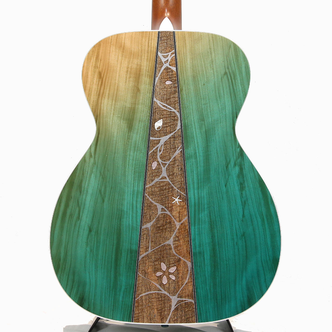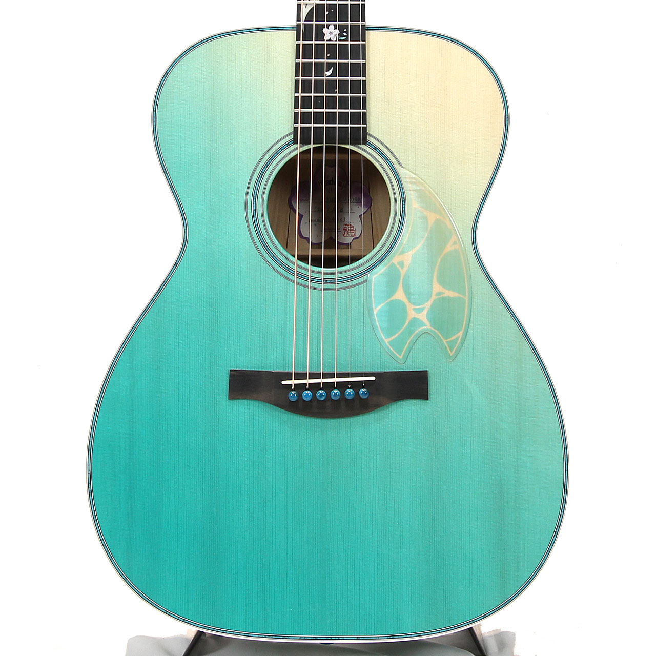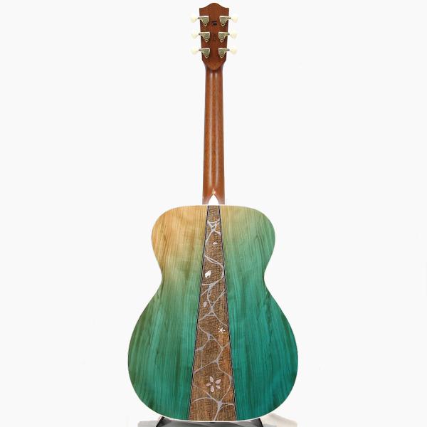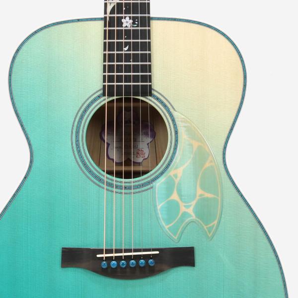 フレイム栃材を用いて作られたピックガードには、フレイムの杢目の上に波模様を塗装で重ねることにより、波打ち際の揺らめきを表現しました。