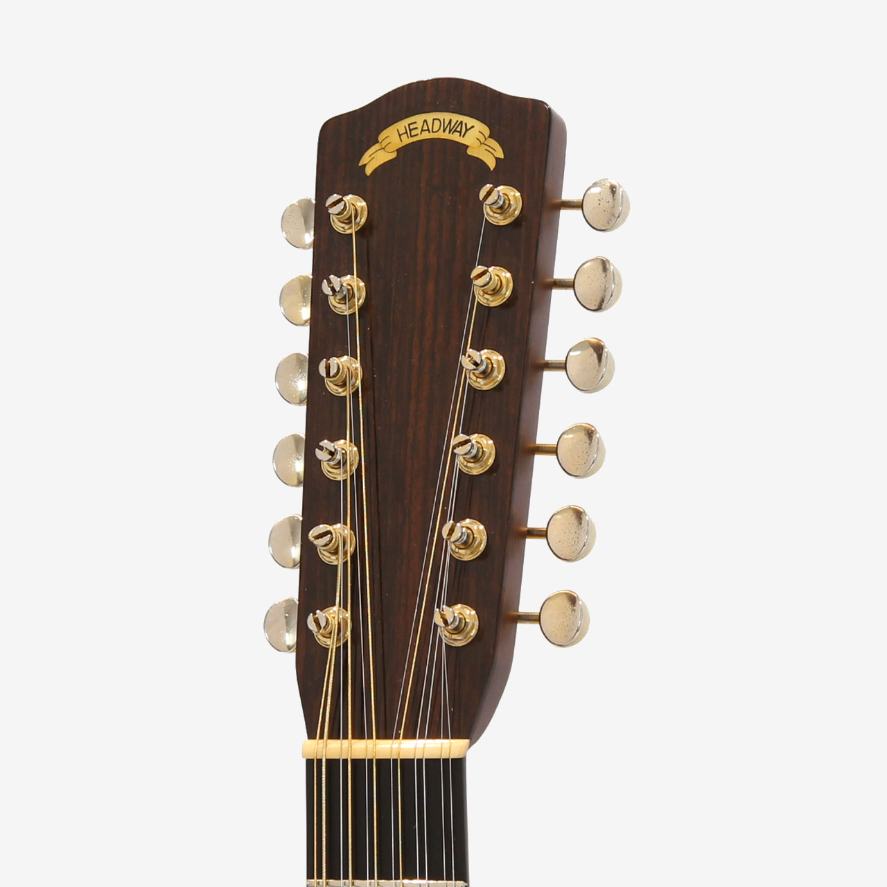 こちらのギターは80年代初頭の製造と思われるヘッドウェイのラインナップでも珍しい12弦ギター。 ドレッドノートシェイプにスプルーストップ、ローズウッドサイド&バック、マホガニーネック、エボニー指板&ブリッジ、47mmナット、628mmスケール。