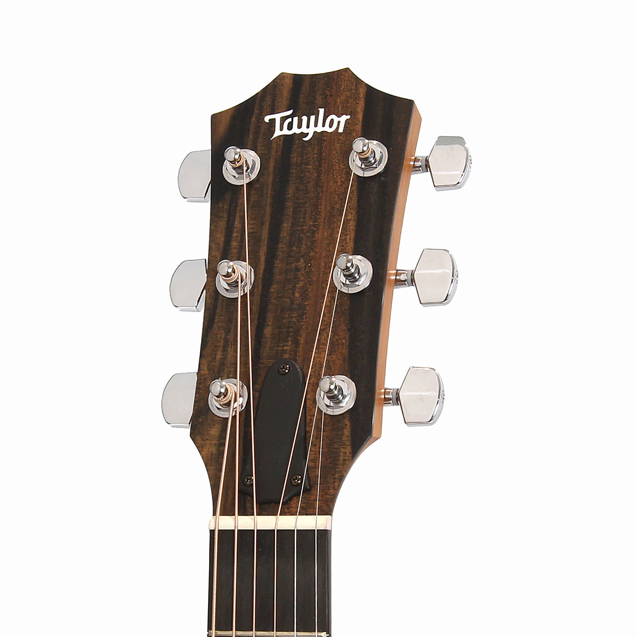 全体的な仕様としましては、トップ材はトリファイド・スプルース、サイド&バック材にレイヤード・ウォルナット、マホガニー材ネック、弾きやすさを追求した約43mmナット幅の細身のテイラー・ネック、エボニー材ブリッジ&指板、アメリカ製上位機種と同じES2ピックアップシステム搭載、専用ギグケース付属と本格的な音楽活動にも応えられる十分なスペックを兼ね揃えております。