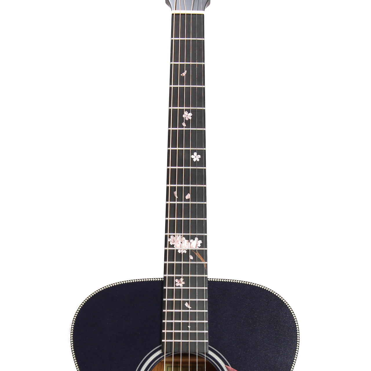指板には桜の花びらを模ったインレイが指板を美しく彩ります。通常のポジションマークをもつギターから持ち替えても違和感が少ないよう、桜の花びらの配置を考慮しています。