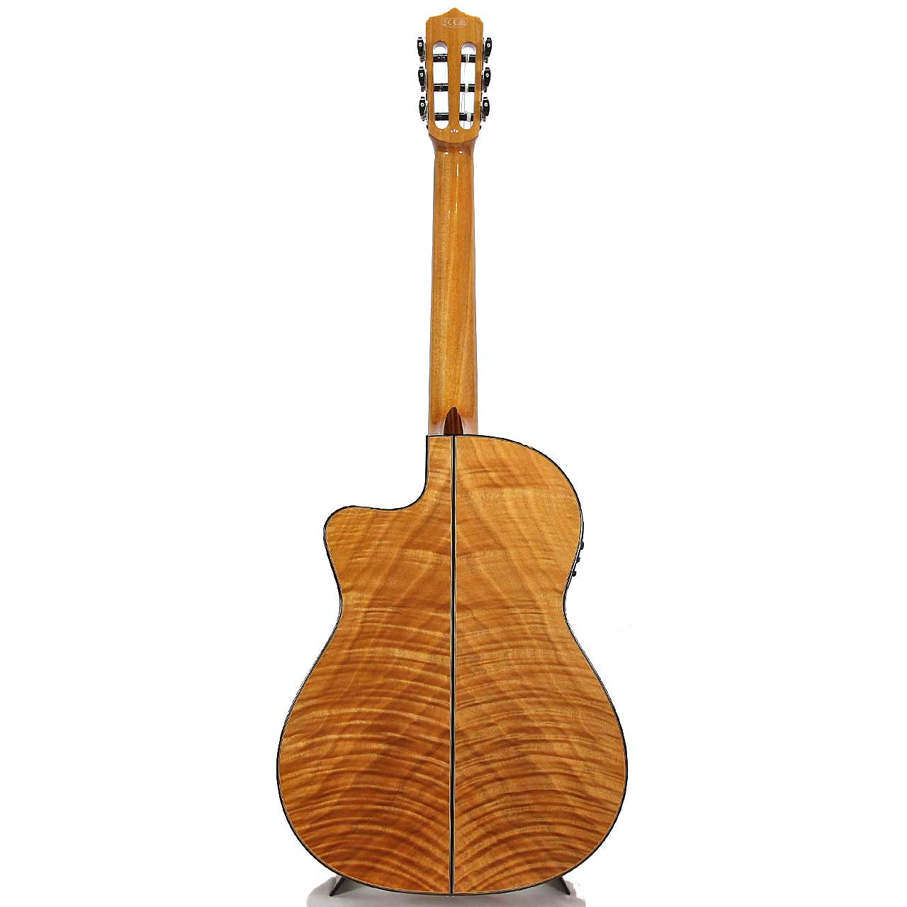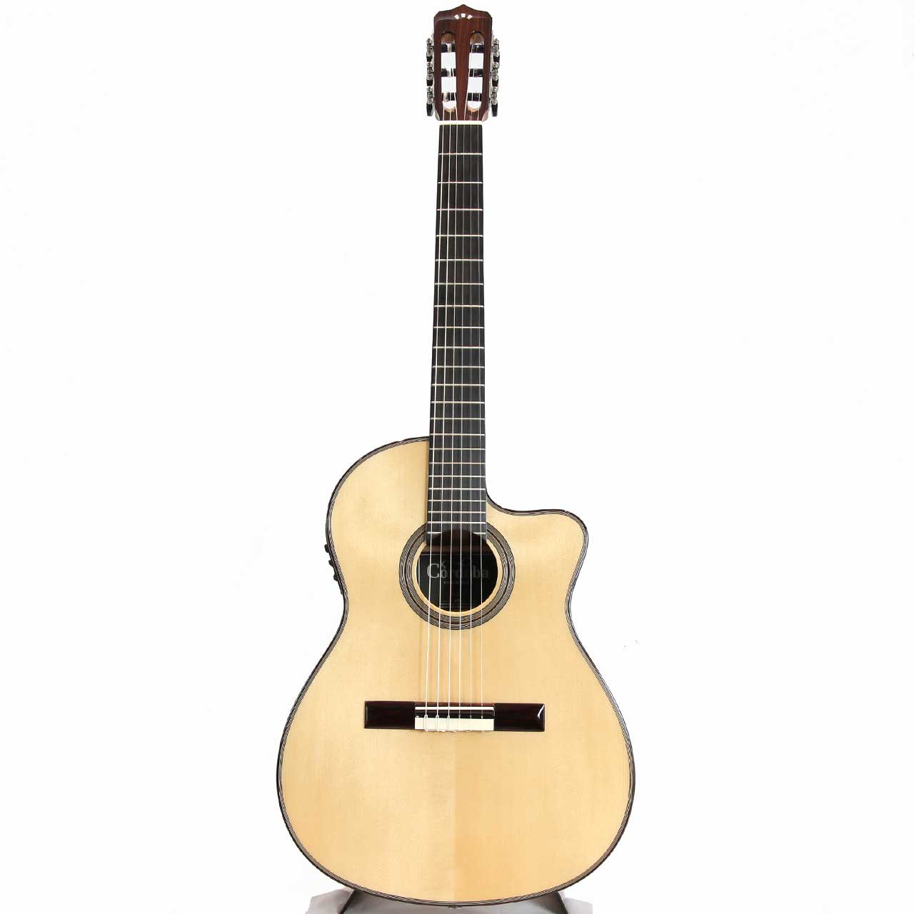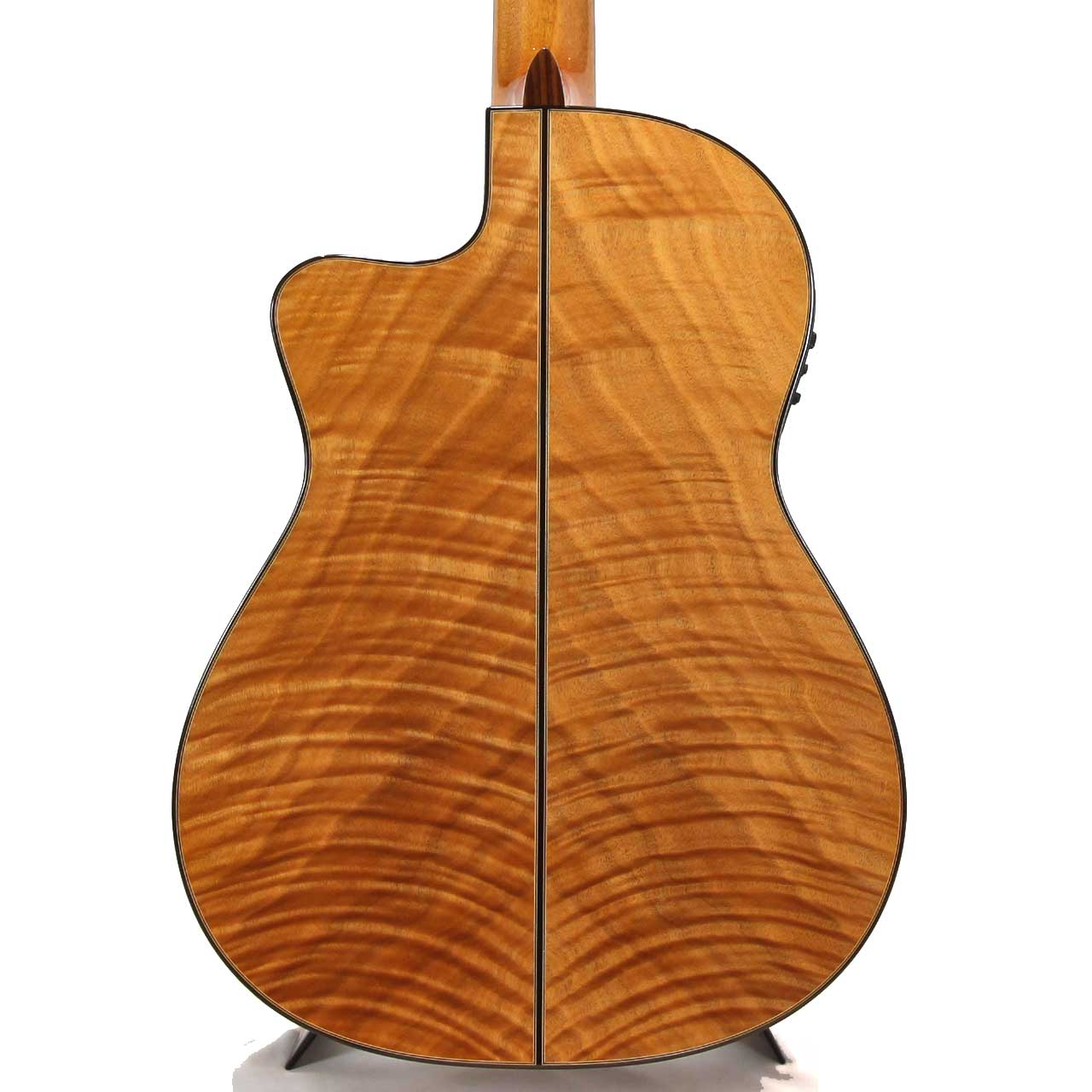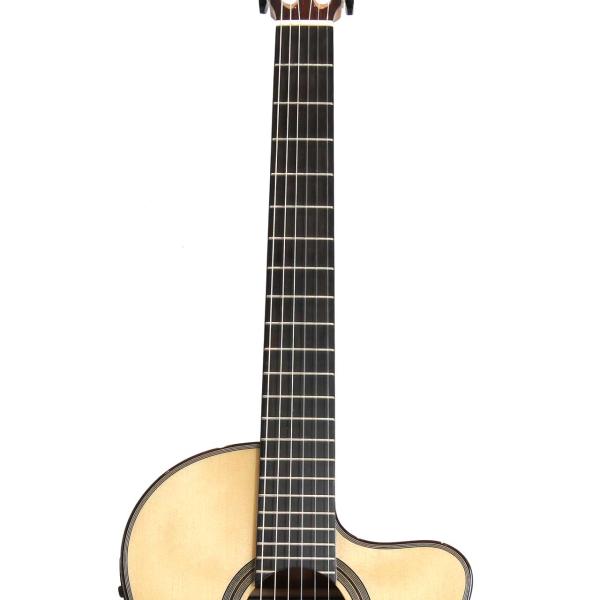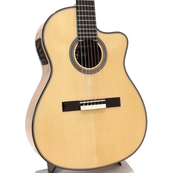 ヨーロッパ・スプルース単板トップ、非常に美しいフレイム・メイプル材バック&サイド、カッタウェイ付きフル・ボディ、サイド・ドット・フレット・ポジションマーカー、フュージョン・ネックは16インチ・ラジアスの指板で、ナット幅は狭めの1 7/8インチ(48mm)、Fishman Presys VTピックアップ搭載のエレガットスタイル。