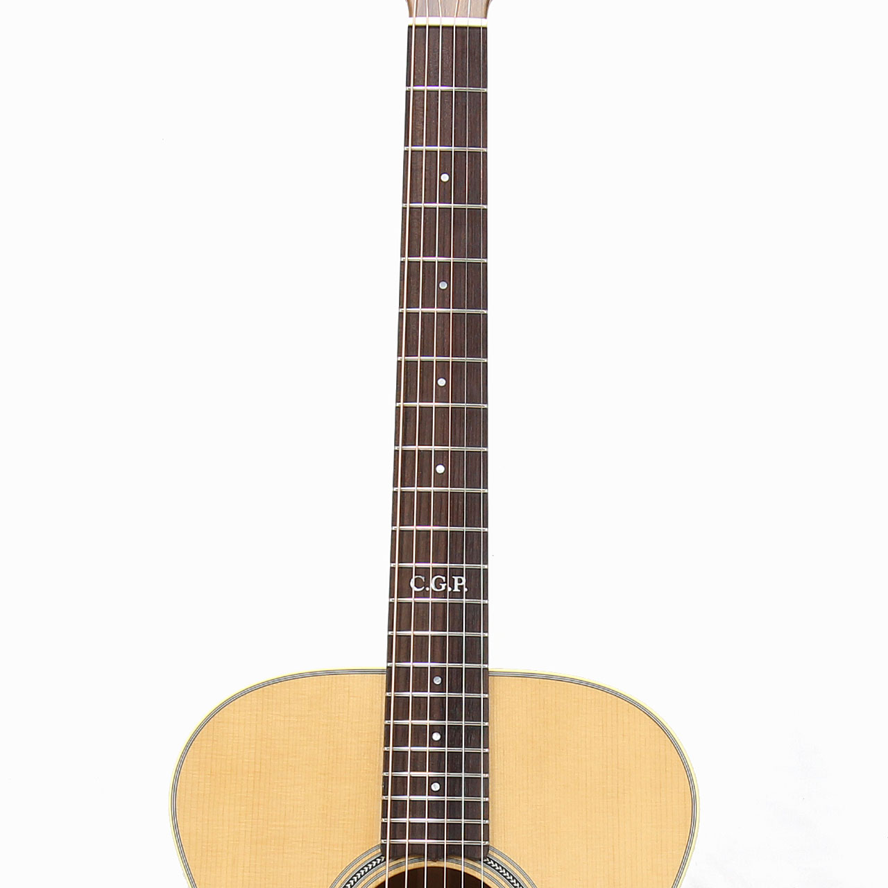 ネック材には1ピースのマホガニー材が使用されていることや、全体的なネックフィーリングの良さ、サイドバックには美しいフレイムの出たクイーンズランドメイプル材を厳選、12Fに輝く「C.G.P」(Certified Guitar Player)インレイや、4mmドットポジションマーク、19Fサイドポジションマークなど、細やかな部分までレギュラー品とは一線を画す、さすがの本人ドンズバ仕様となっております。