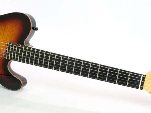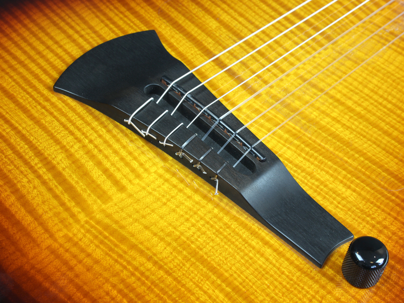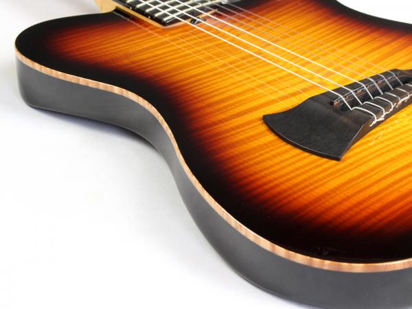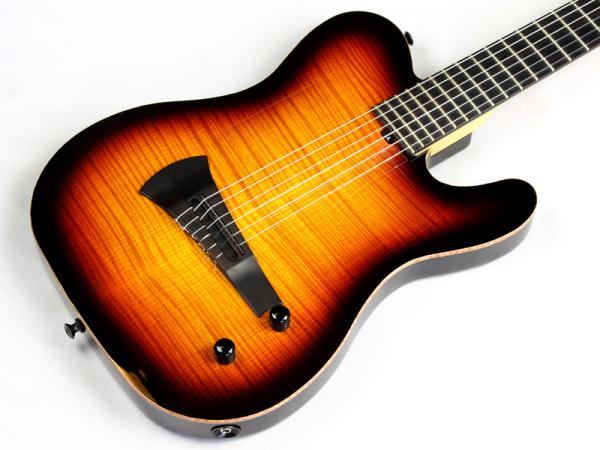 エボニー指板採用スペック(通常ではモラード)となっており、美しいフレイム杢目が浮き出たメイプルTopに、チェンバードのマホガニーBackの組み合わせ。ナット幅46mmとなっており、エレキとの持ち替えを前提として製作された薄いネックシェイプは、違和感が殆どないように仕上げられており非常に演奏性に富んだモデルとなっております。エレクトリック部分はBarberaピックアップにSadowsky製のカスタムプリアンプを搭載しており、ボリューム&トーンのシンプルなコントロールは非常に扱い易く、アンプに繋ぐだけで甘く艶のある極上のトーンを奏でてくれます。