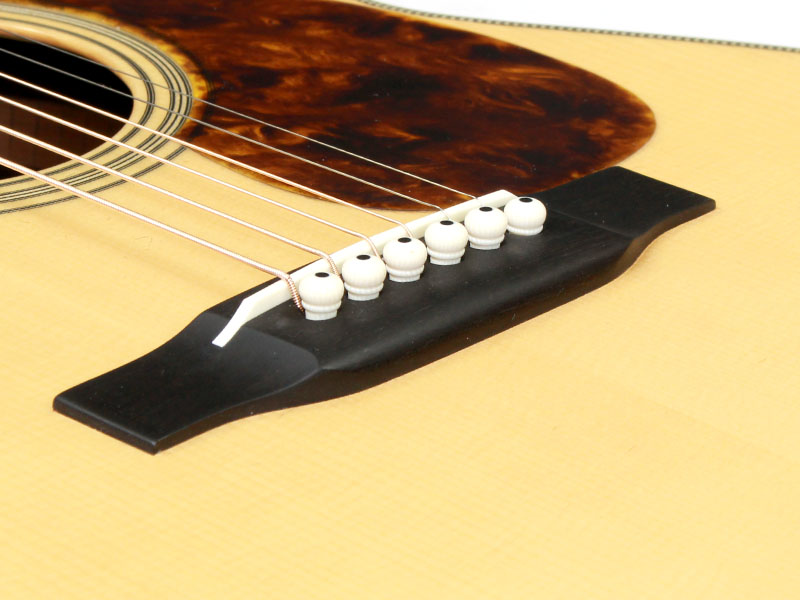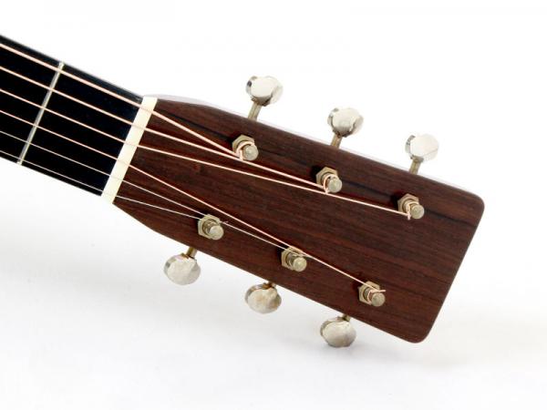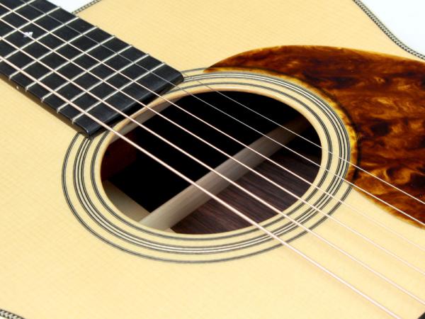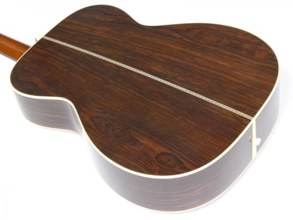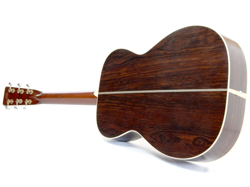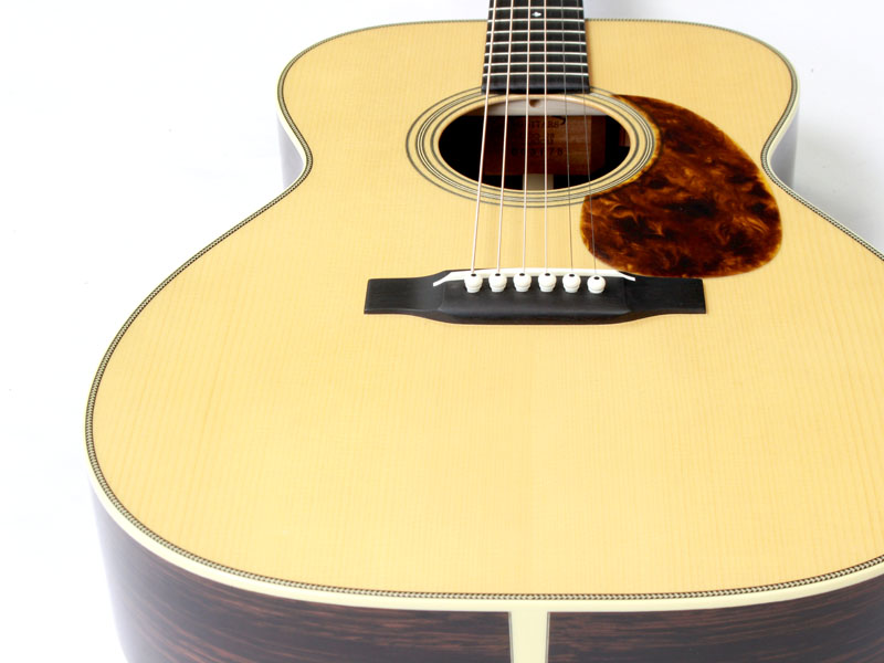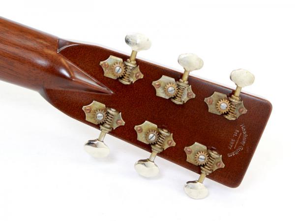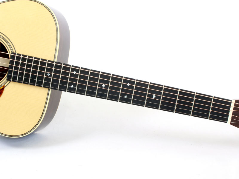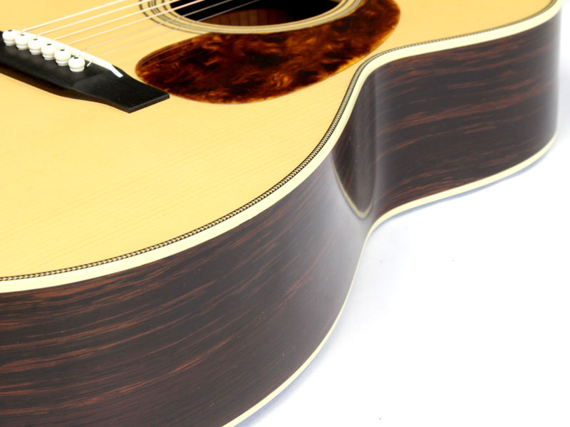 オリジナル00028らしくトップ材は最上級のアディロンダックスプルース、サイド&バックはブラジリアンローズウッド、1ピース・ホンジュラスマホガニー材ネック、エボニー指板&ブリッジ、ブラジリアンローズウッド天神付き板、牛骨ナット&ロングサドル、44.45mmナット幅、632.5mmスケール、Waverly #4076 Relicペグ、アイボロイドバインディング、ヘリンボーントリム、TOR-TIS 30s ピックガード、オールラッカー塗装仕様。35年頃までのMartinにならい、メーカーデカールロゴも無しにしてオリジナルマーチンのようにヘッド裏に焼き印を入れております。