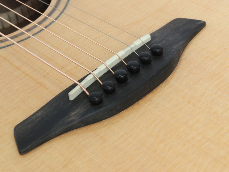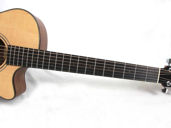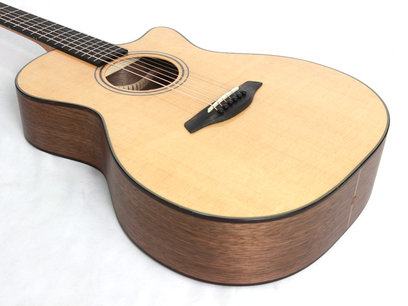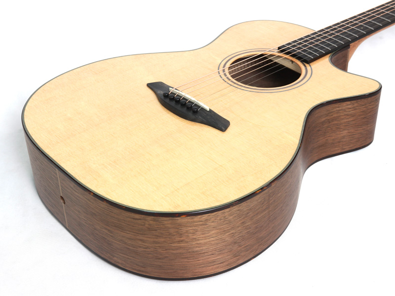 スペックは小振りで抱えやすいOMボディを元に、トップ材はシトカスプルース、サイド&バック材にウォルナットを採用し、マホガニー材ネック、エボニー材指板&ブリッジ、ナット幅45mm、ペグはフォルヒのオリジナル仕様となっております。