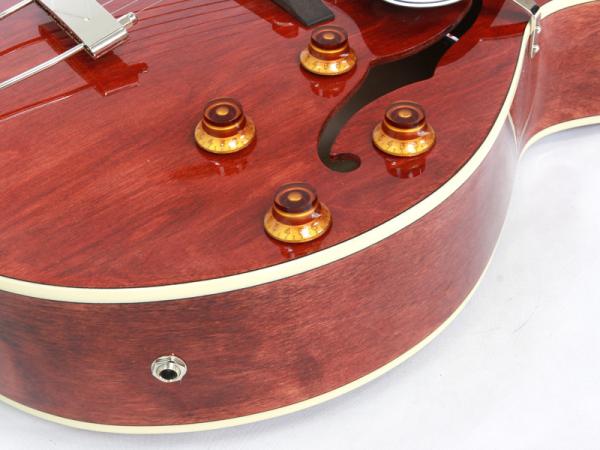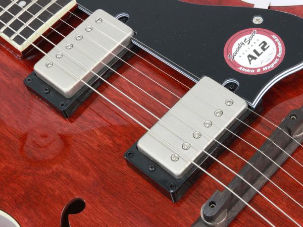 トラディショナルなFホールホロウメイプルボディ、メイプルセットネック、オバンコール指板。スリムなネックやフレットエッジの仕上げ、安定したクルーソンペグ搭載など、手に取りやすい価格帯ながらプレイアビリティに妥協のない拘りの仕上げです。
