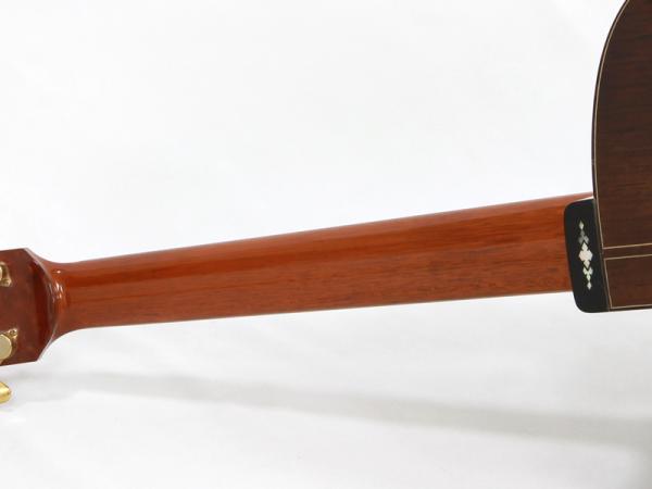 ボディ形状は一番人気のモディファイド・ドレッドノートのカッタウェイで、トップ&バック共にラティスブレーシングの仕様。トップ板はスプルース、サイド&バック板はブラジリアンローズウッド、マホガニー材ネック、エボニー指板、ブラジリアンローズウッド・ブリッジ、ゴトー510ペグ、約44mmナット幅、約641mmスケールのスペックです。