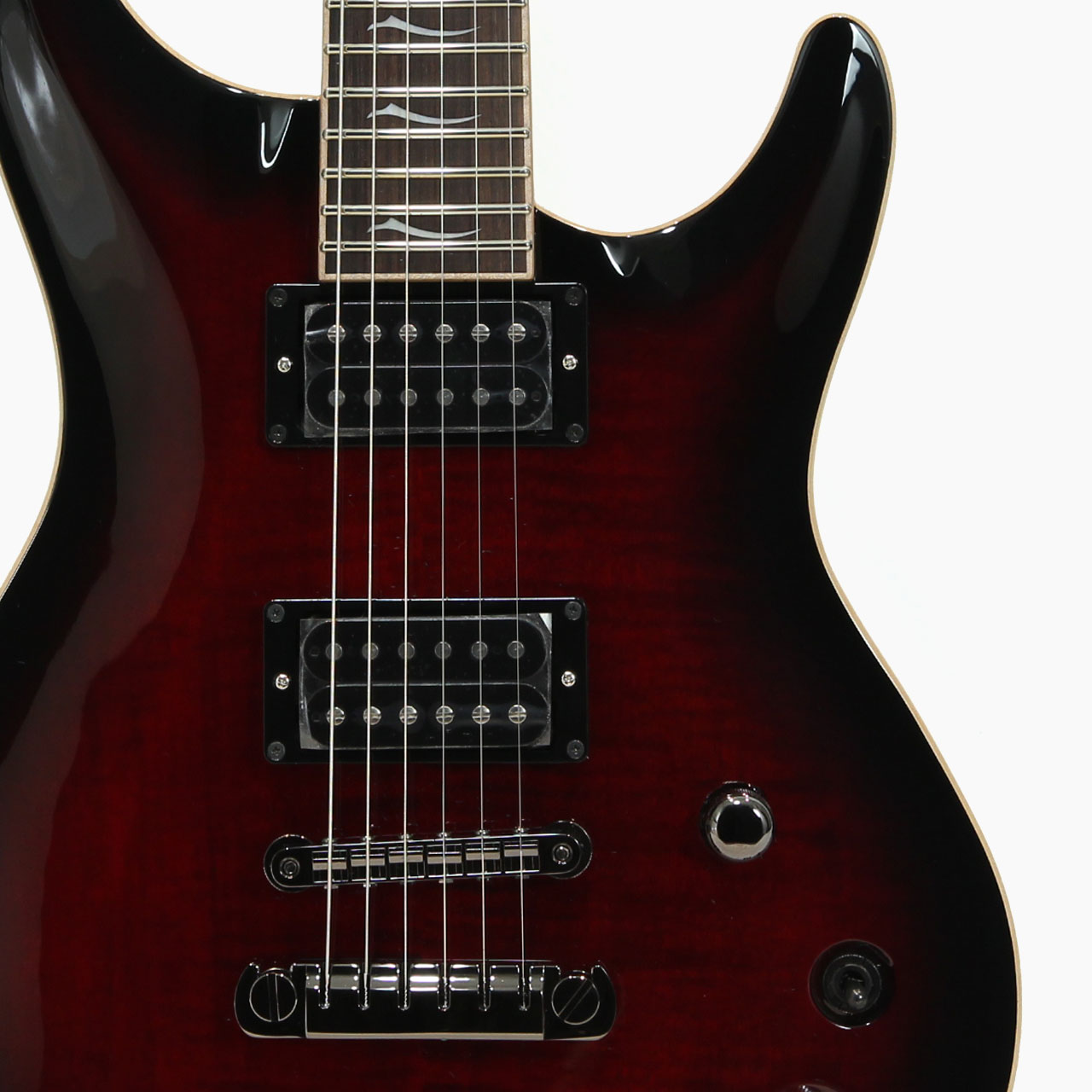 フレイムメイプルトップ、マホガニーバックボディにローズウッド指板の王道仕様に剛性のあるメイプル/ウォルナットの5ピース構成とすることでヘヴィかつレンジあるサウンドを演出してくれます。弦を裏通しにもすることができるのでダウンチューニング時も安定したテンション感を確保してくれます。こういった充分な対応力が幅広いユーザーの愛用に繋がっております。