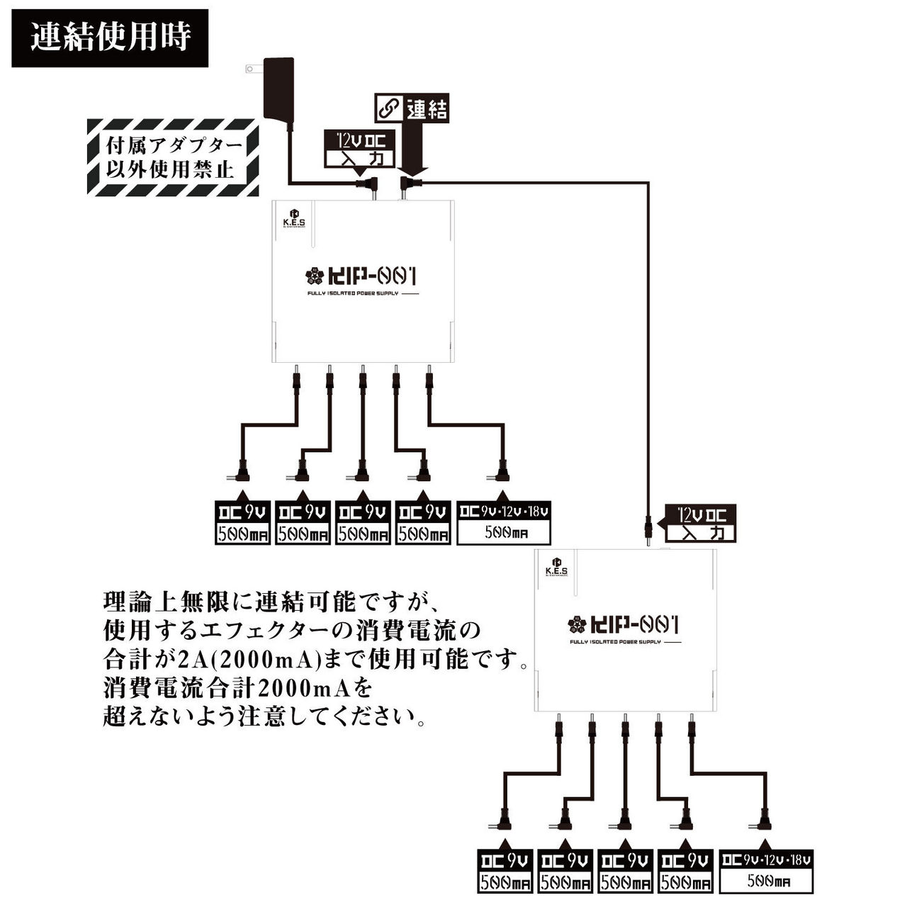 ※理論上無限に連結可能ですが、使用するエフェクターの消費電流の合計が2A(2000mA)まで使用可能です。消費電流合計2000mAを超えないよう注意してください。