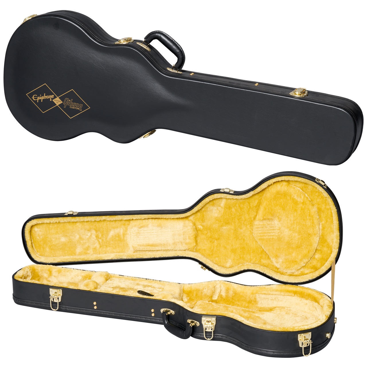 ワンピースマホガニーネック、50年代の握りごたえのあるネックシェイプをイメージしたラウンデッドCプロファイル、エボニー指板、マザーオブパール・ブロックインレイ等"タキシード"と称されるLes Paul Custom の気品ある仕様の数々を採用。ギブソンスタイルのオープンブック・ヘッドストックの上面にはマザーオブパール・スプリットダイヤモンド・インレイとエピフォン・ロゴのインレイがあしらわれております。ギア比18:1のGrover Locking Rotomaticチューナーを含むゴールドハードウェア等、目を引く仕様に溢れています。