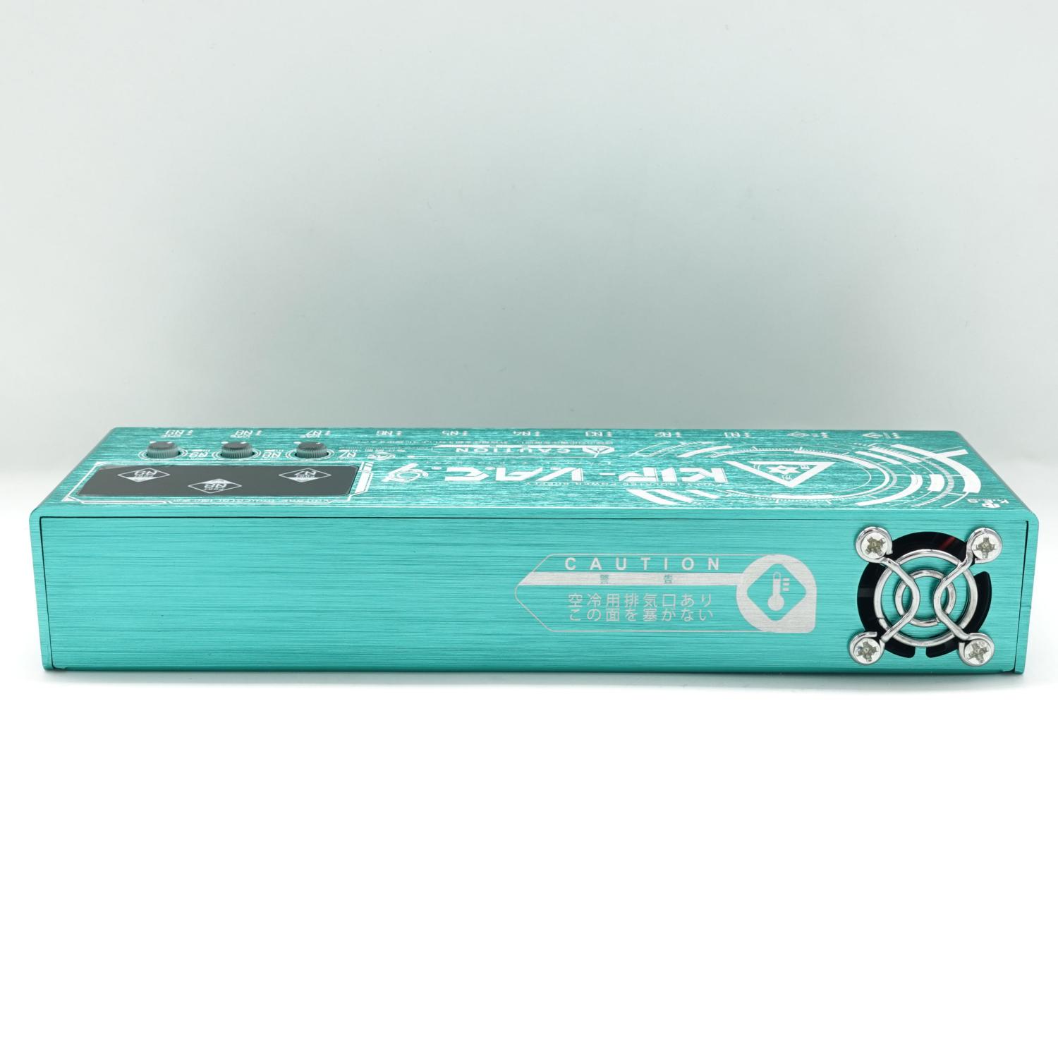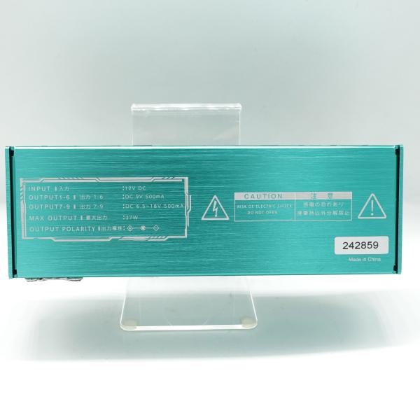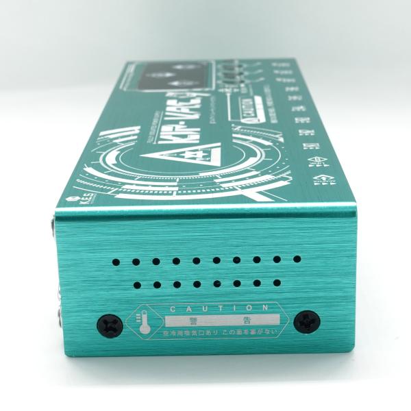 電圧をコントロール可能なボルテージアジャスト機能搭載のポートを3つ、無負荷時供給電圧を約9.8V(最適環境下において)のポートを6つの全9ポートを持つパワフルで高機能なパワーサプライです。グラウンドまで完全に個別にしたフルアイソレート回路です。Port1-6 は無負荷時供給電圧を約9.8V (最適環境下において)に、高負荷時でも9.4V を確保出来るよう設定。特にDistortionやOverdrive系のペダルで音に張りと厚みが生まれ、ブライトネスも上がる効果も期待できます。ボルテージアジャスト機能により6.5V~18V 間を無段階で 任意の電圧に設定可能(Port7-9)(電流も可変となります。目安として12V時 375mA 18V 250mA)。また、ボルテージインジケーターにより設定電圧を見える化。これらの機能により電圧が低めの電池をわざわざ用意して行っていたFUZZ への低電圧供給も持続可能になりました。小型のファンを搭載し、サイドから空気を取り込むことで冷却性能を飛躍的に向上させました。熱損失を最大限に減らして電力効率の上昇を実現(最大出力27W※)しました。